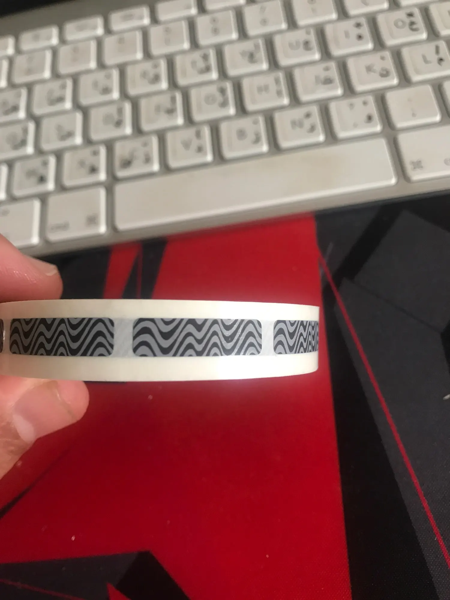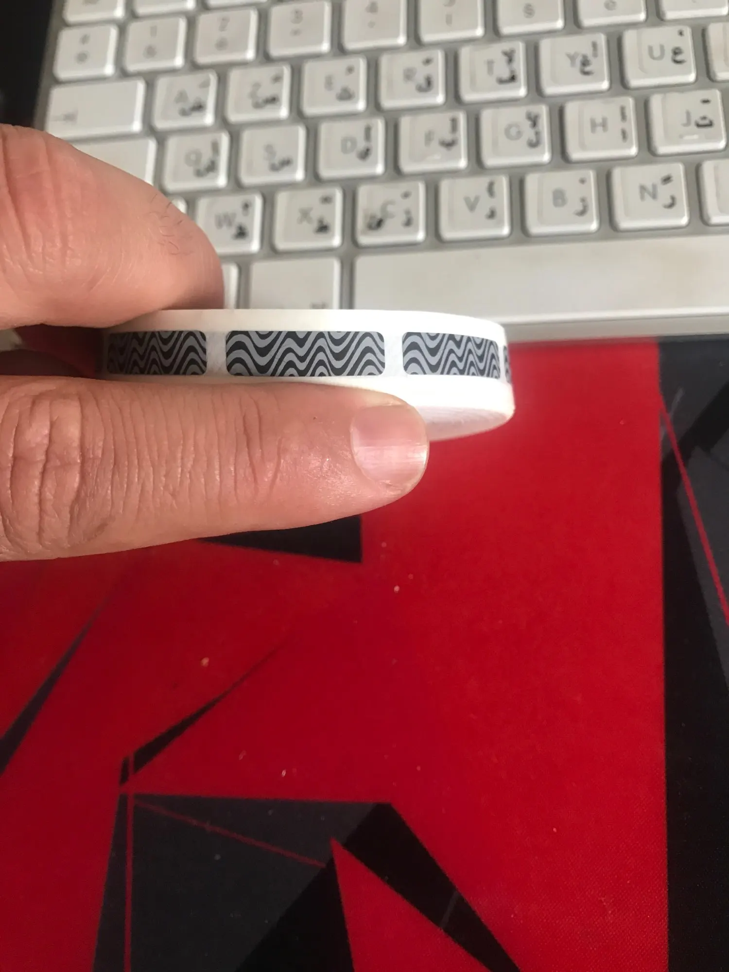 As depicted. Works as expected (covering hidden text, can be scratched off, if pressed-on well doesn't peel off without visible damage to paper). Awesome fast delivery: 15 days to Germany.