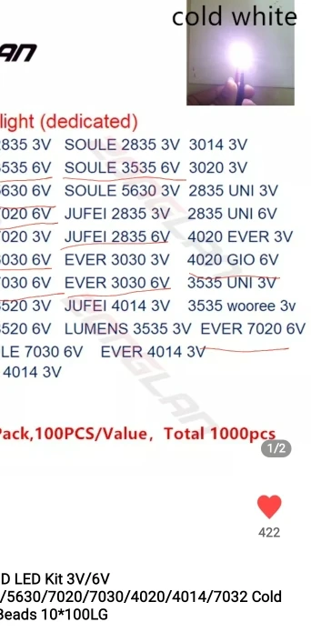 1000pcs/lot 1W-2W SMD LED Kit 3V/6V 2835/3030/2828/3535/5630/7020/7030/4020/4014/7032 Cold white For TV Backlight Beads 10*100LG