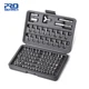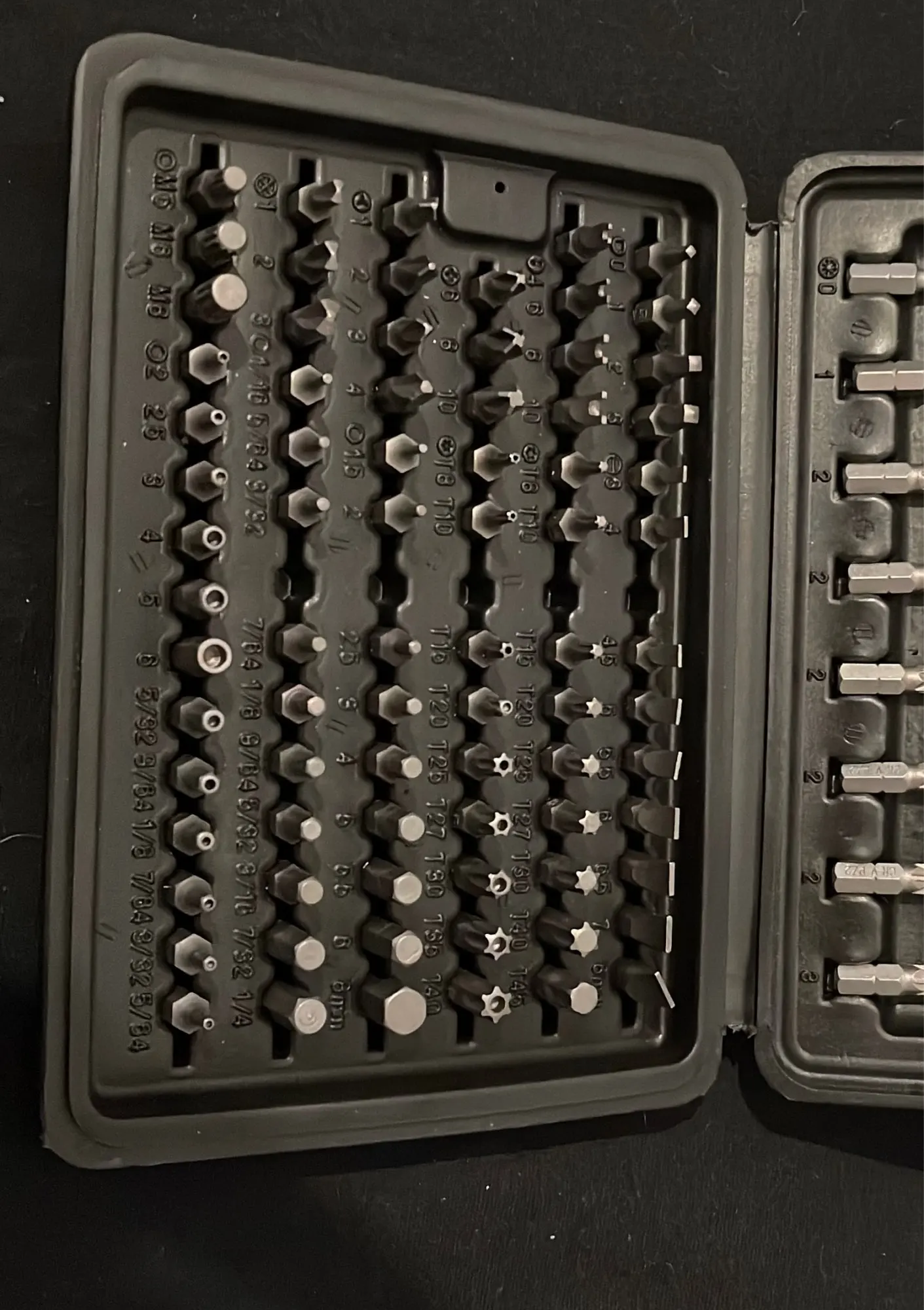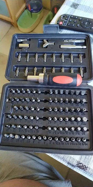 Arrived in 32 days. Shipped after 4 days. Packed well. No visible defects or damage. The item is as advertised. There are exactly 100 pieces in this screwdriver set. Handle works as advertised. I used it to open some different screws and the set I received had those screw heads. The pieces themselves are not magnetized but the handle and the stem are magnetized. So far so good. I recommend it.