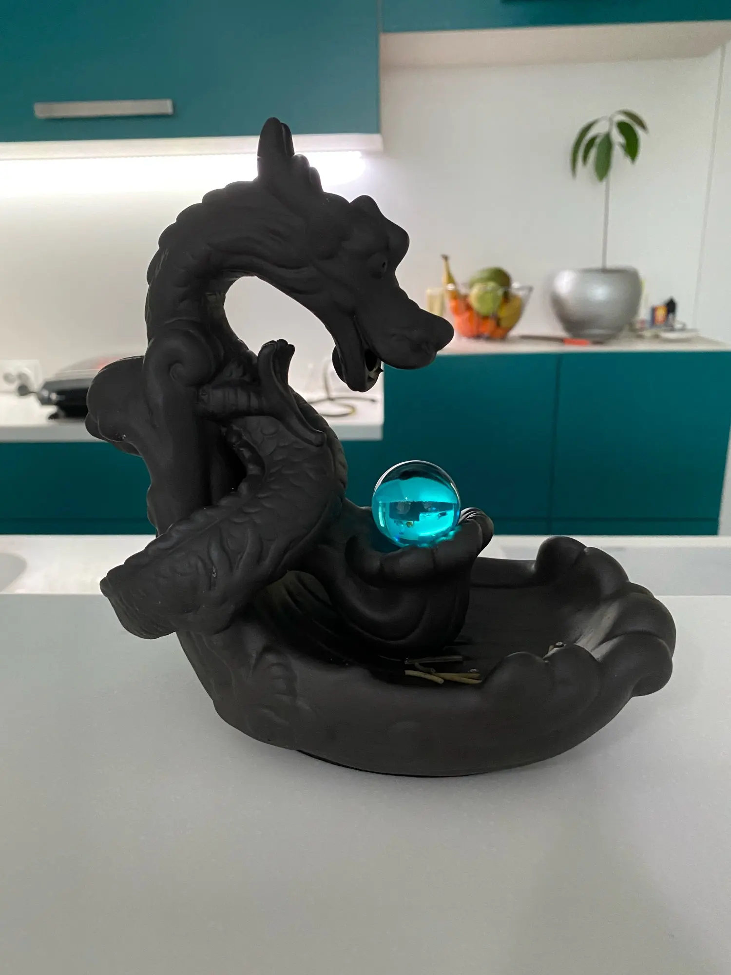 came undamaged, well-packed. great looking dragon with crystal ball. incense smoke flows downwards as described