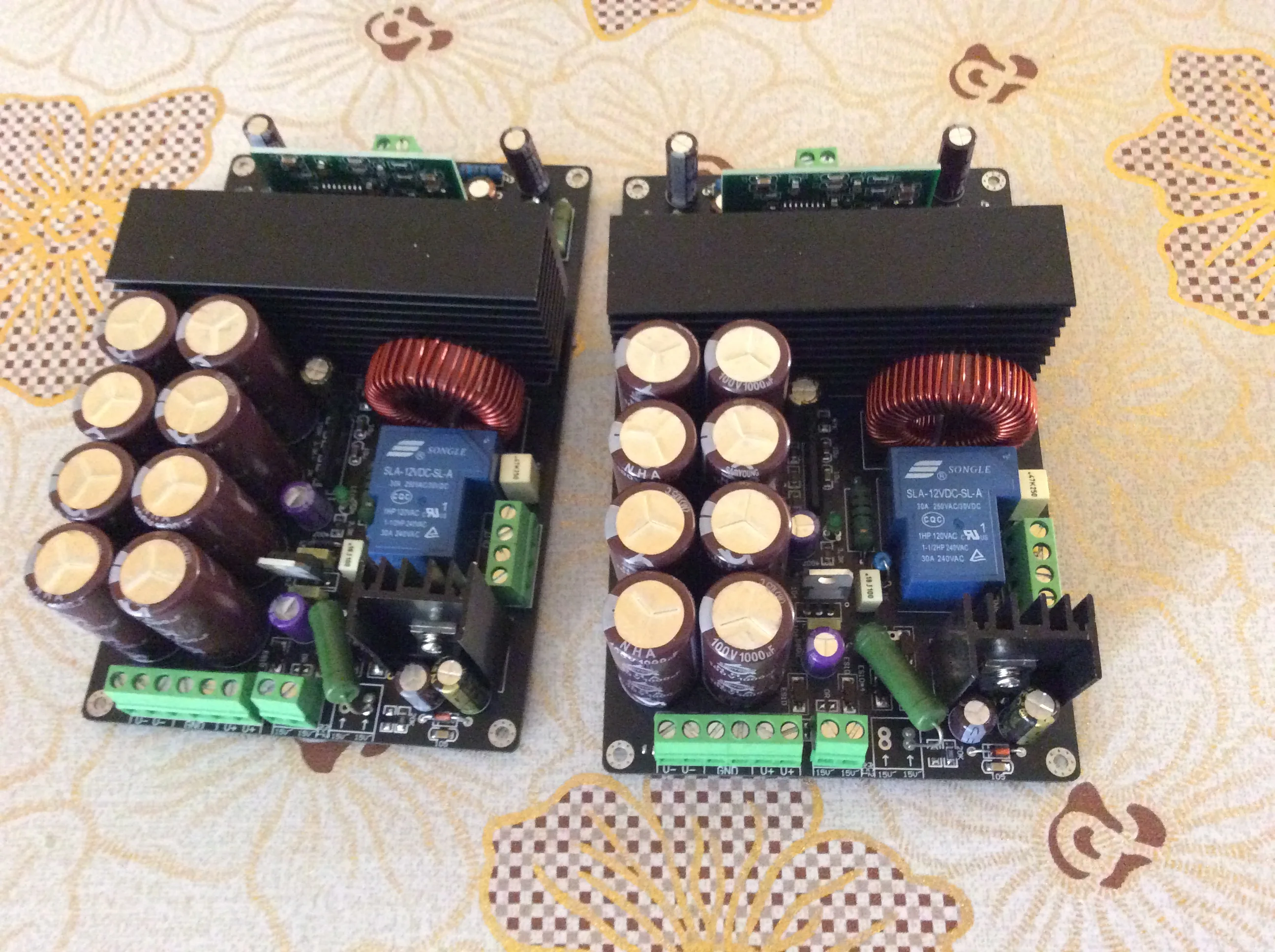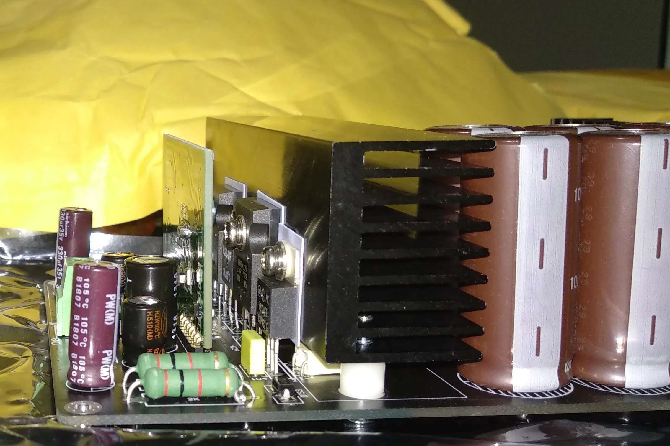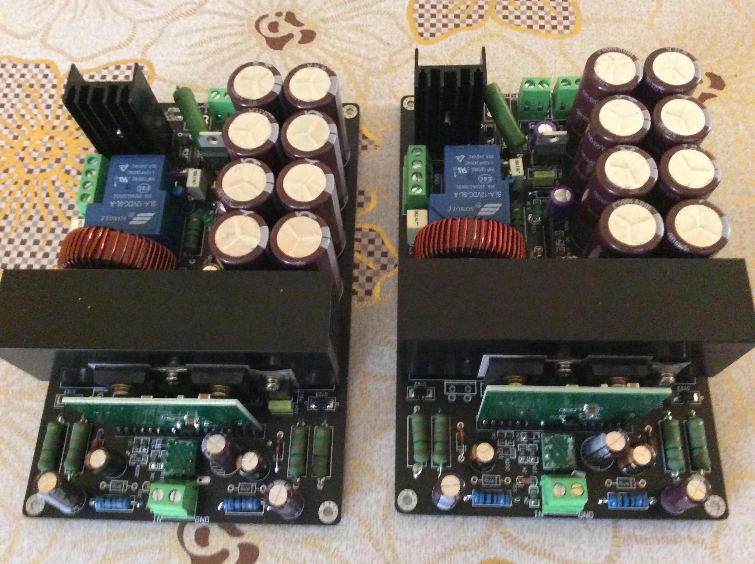 This amplifier has 280W RMS at 8R and power supply (+ -75VDC), with a load of 4R the amplifier has a power of almost 500W RMS and heats up a lot.