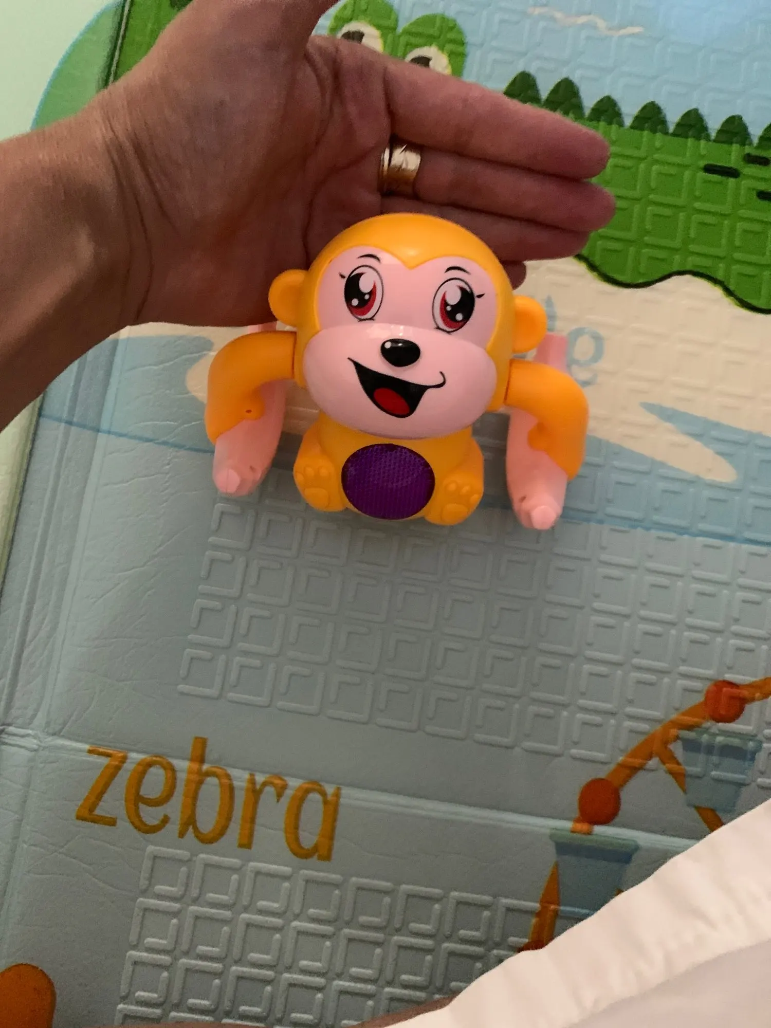 delivery was a little long, it is a little smaller than I thought but that doesn't matter. I bought it for my 4.5 month old, but my 2 year old loves it even more! it moves, lights up and makes sounds. overall I'm happy!