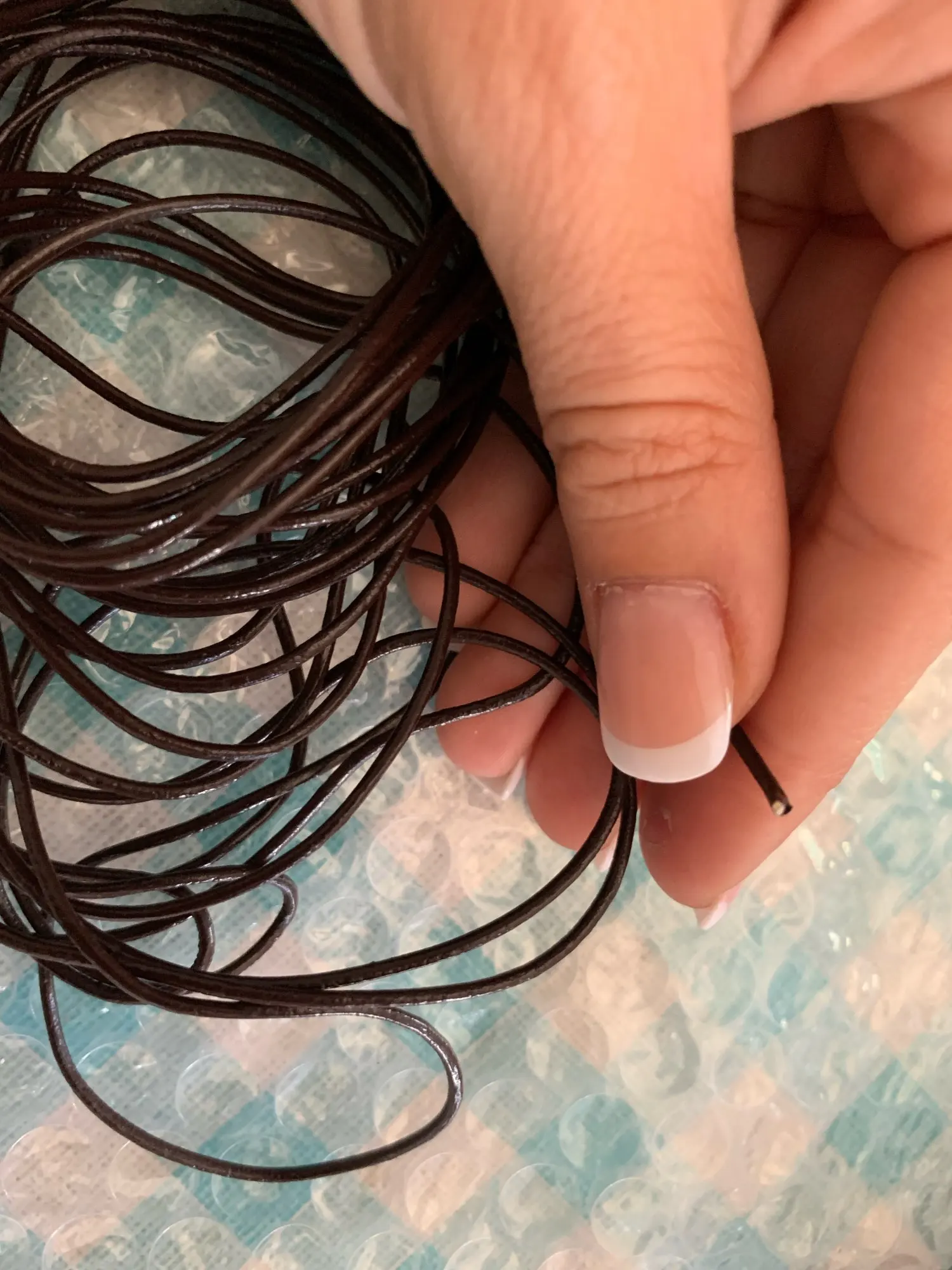 I do not think it is a leathter cord, stinks with very sharp poisonous, chemical smell. Even after a week outside smell did not go away. No way to use it for jewelry. The sender was not helpful.