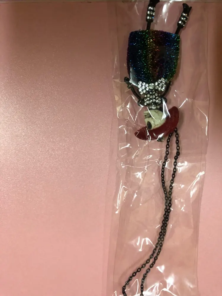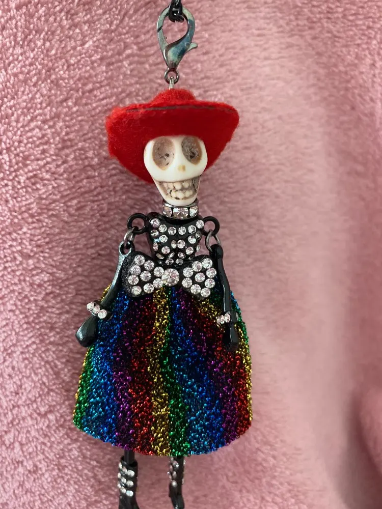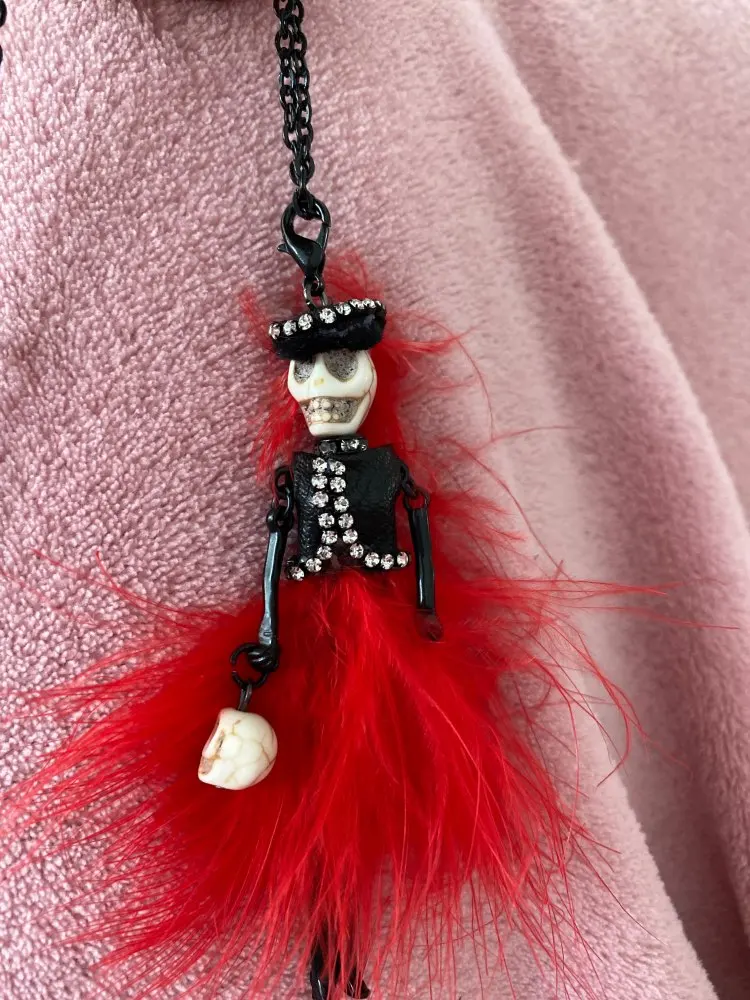 alloy, cloth, rhinstone, fur, skull beads