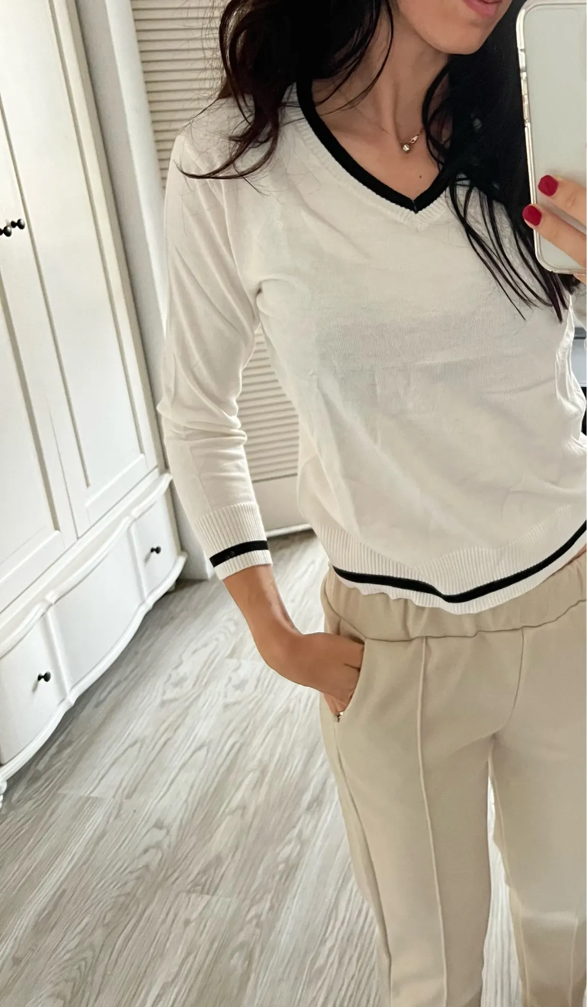 Very nice sweater, true to size. A bit of a smell in packaging, but a few days hanging at it was fine.