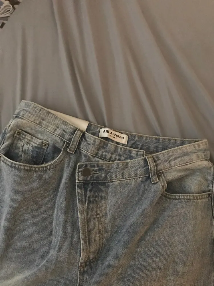 2022 Summer New Fashion Light Blue Women Asymmetric Fly Jeans With Button Closure Split Waist Straight Leg Jeans Plus Size 2S4F