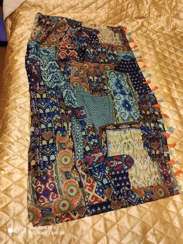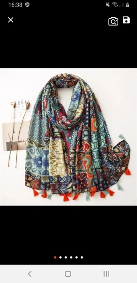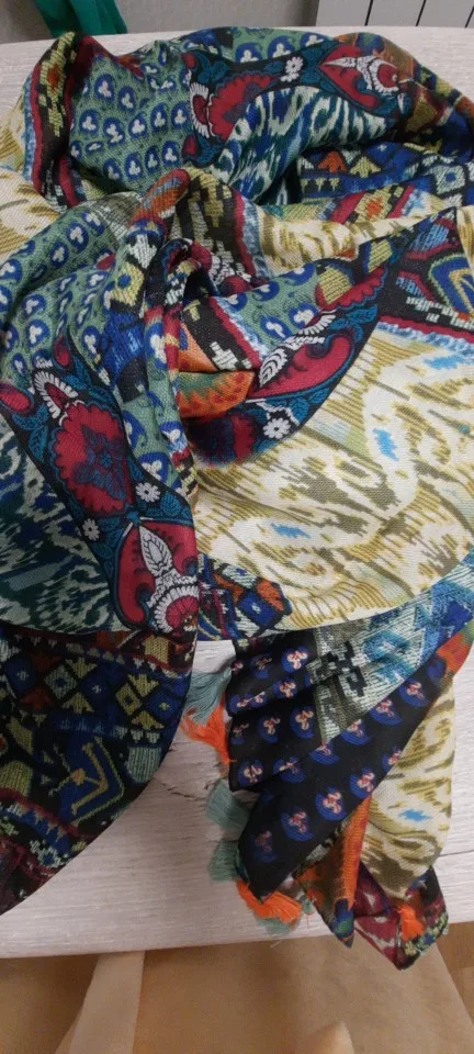 Beautiful scarf...exactly as described and shown in the pictures. Scarf has no sewn tag to tell what type of material it is made from but nevertheless, I love it and I am very happy with my purchase. Thank you.
