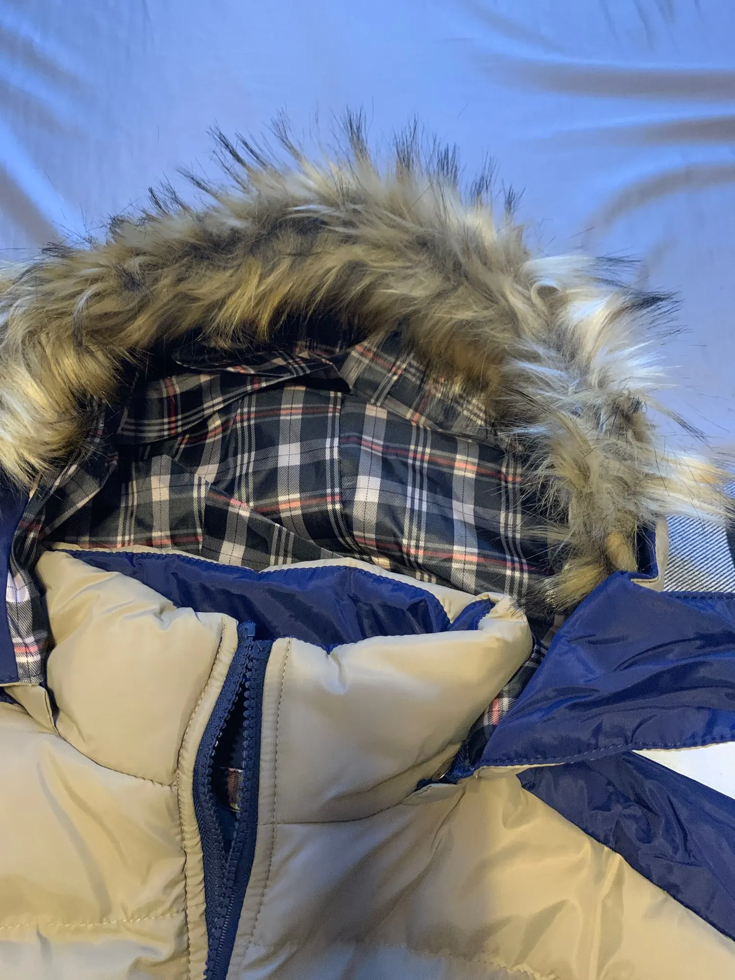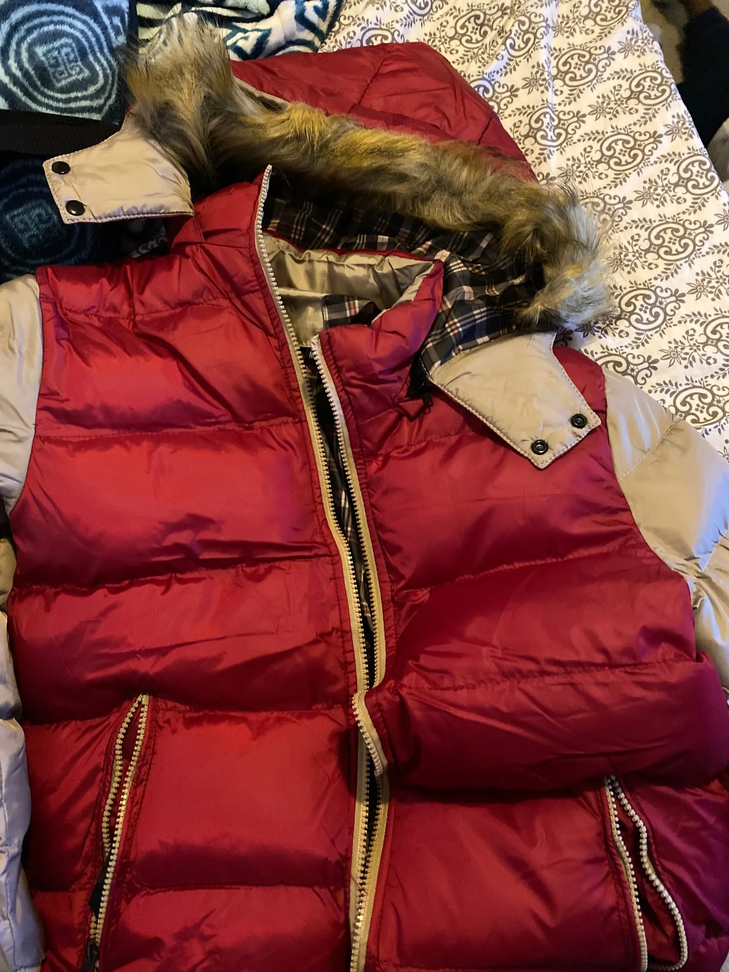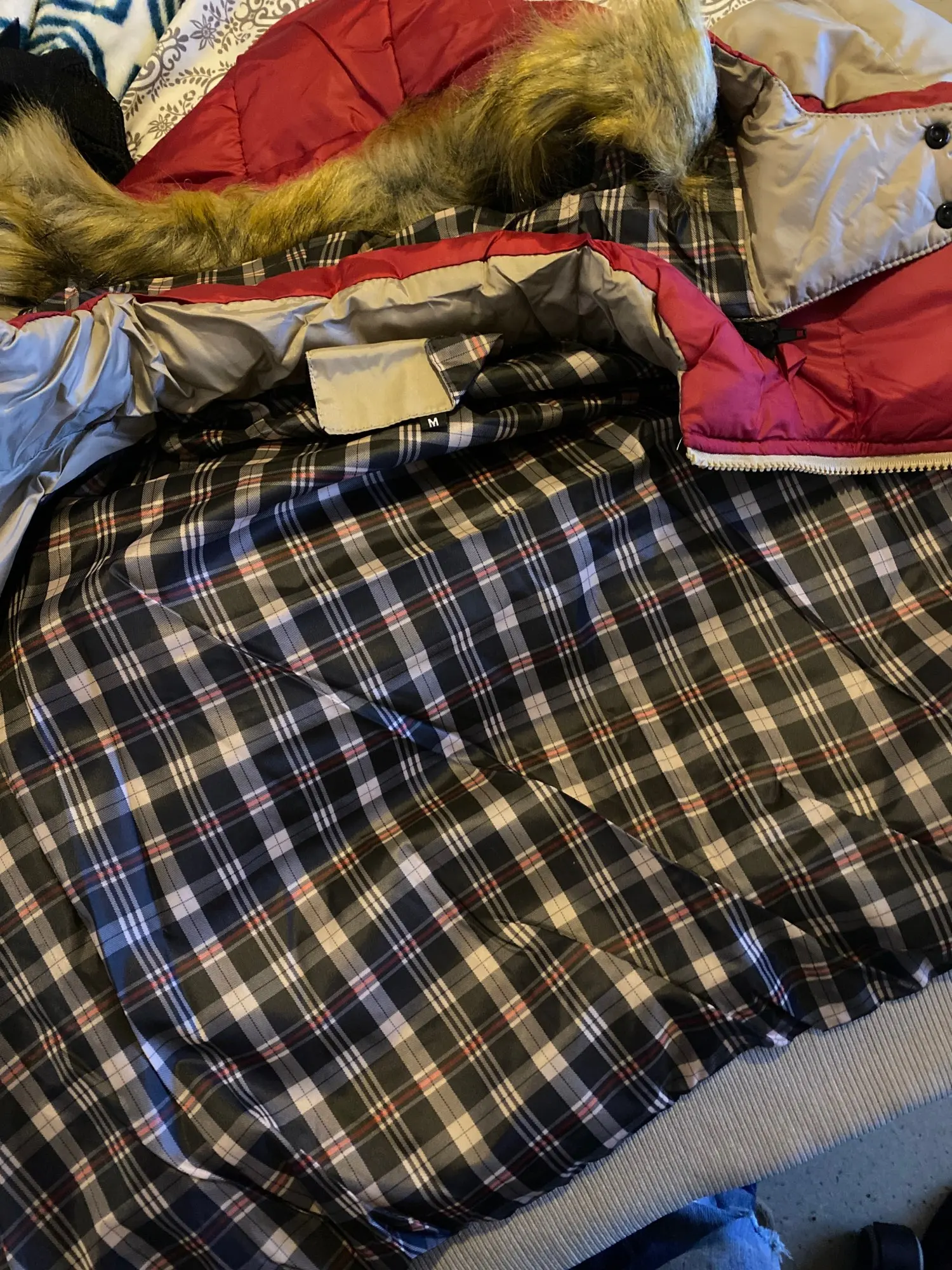 The inside is plaid instead of the burgundy/dark red color that's in the display picture. The color on the outside is is closer to red than what the display picture portrays. It's also very thin. I think that the display picture is stuffed. The thick fur that's in the display picture is also a lie. It's very thin, flat and barely enough to resist a light drizzle of rain much less strong winds and snow.