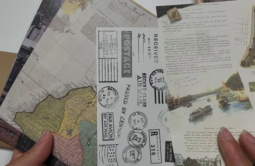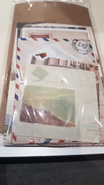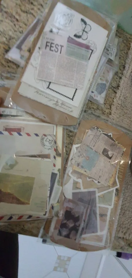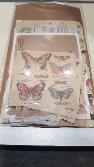 Nice vintage set. Some cardstock, paper, washi stickers, tags and stickers. Got more than 30 pcs inside. Essentially no repeats but I got around two extra of the same patterns. There are 3 huge washi stickers. If you want each piece, you need to cut it out.