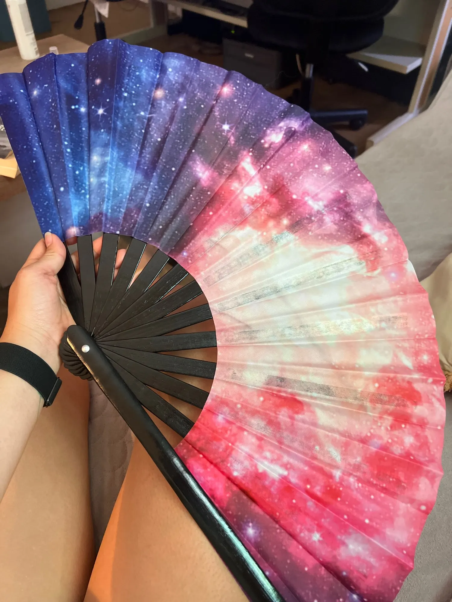Accurate description but the picture is a bit deceptive as the nylon material is thin, so you see all the bamboo frame arms and it's not nearly as bright red in reality. Still a good size for my make-up drying needs.