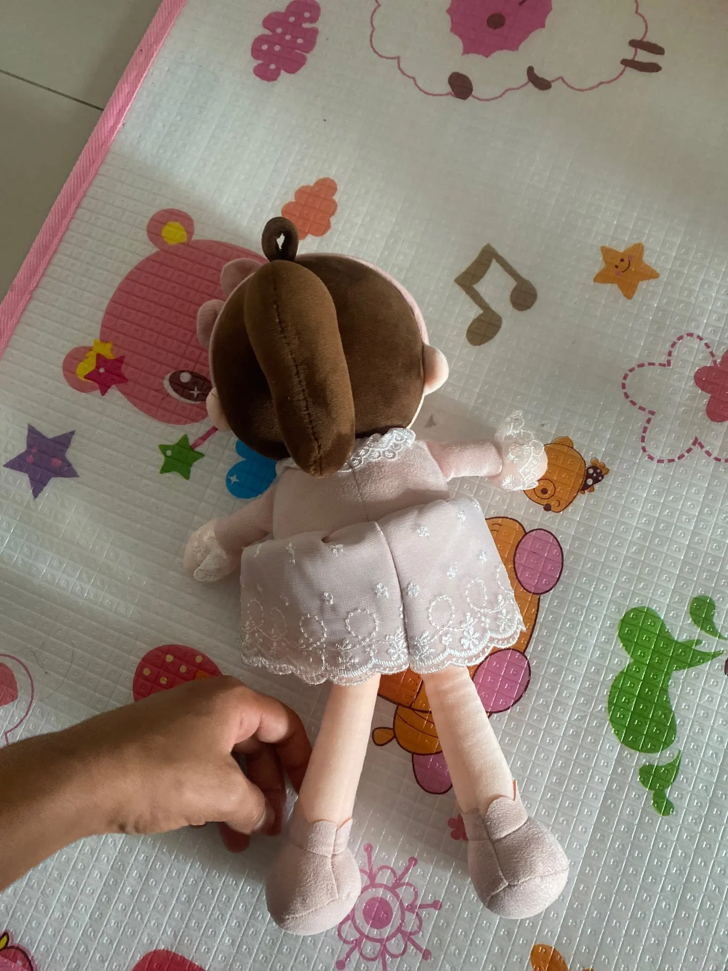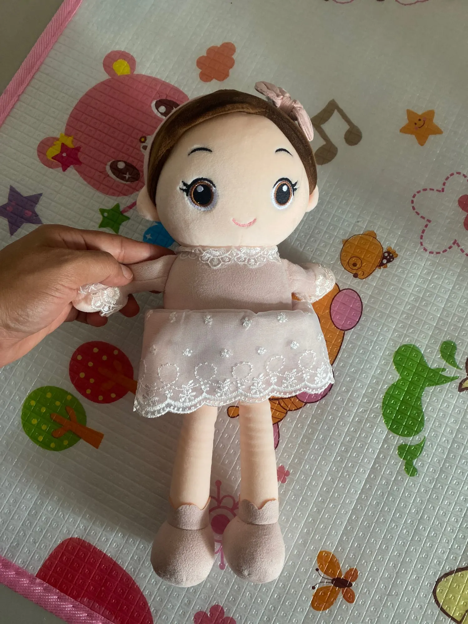 So cute and soft! It actually has a ponytail which makes the doll so much cuter! No bad smells and can't wait to give to my 9 month old. Wish the doll wore underwear though haha just for modesty purposes.