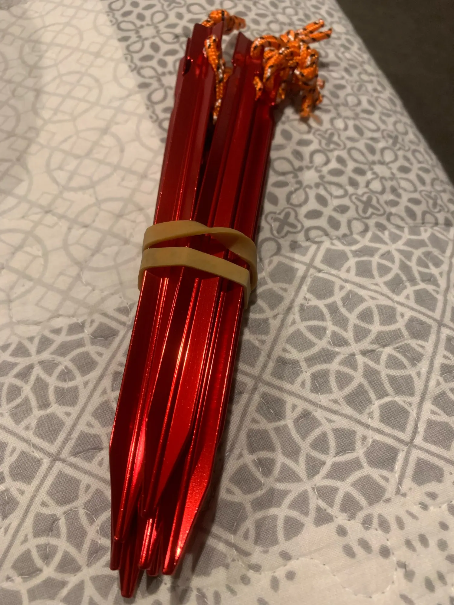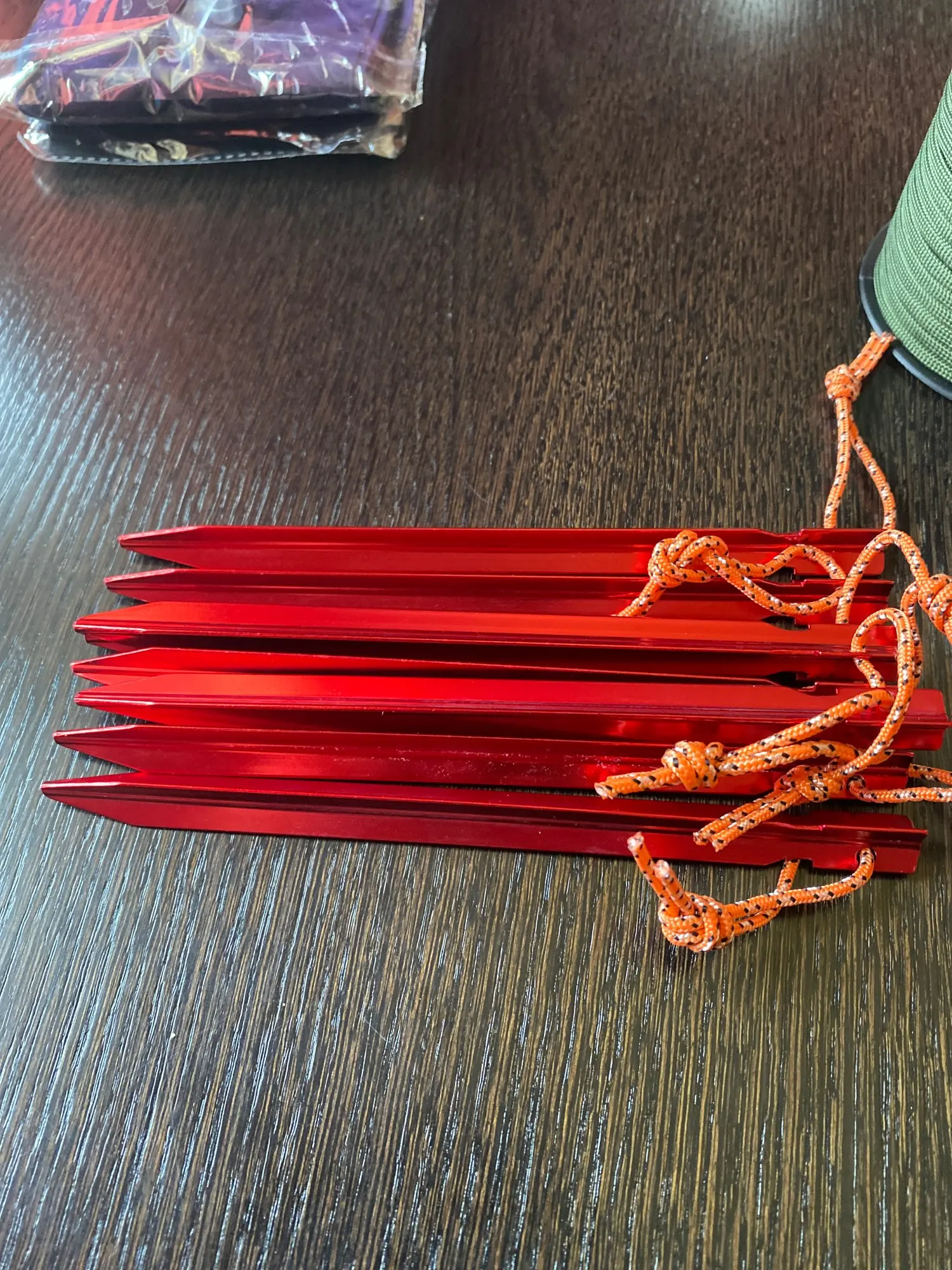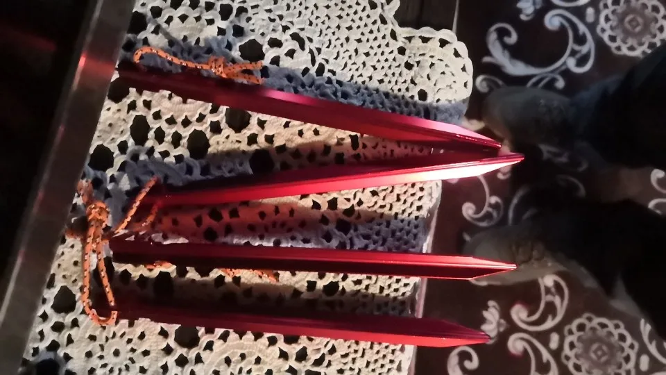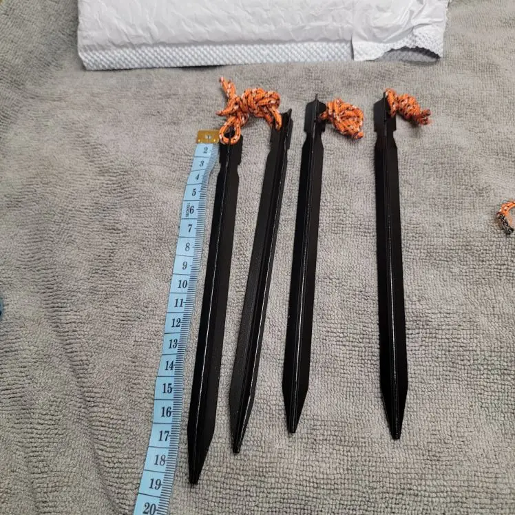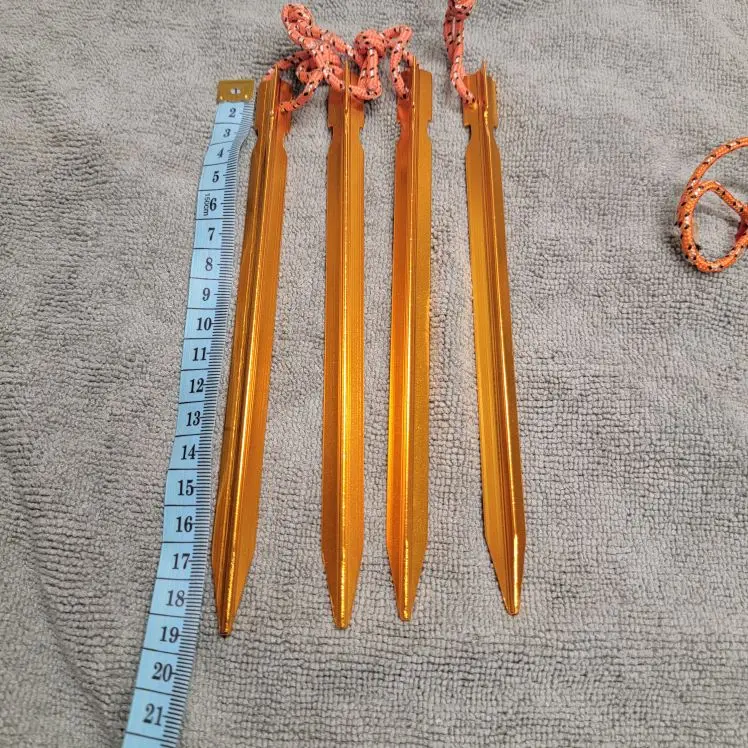 Great tent pegs, light weight, stiff, easy to put into ground by standing on, won't bend easily, easy to take out of ground with rope loop, easy to find on ground. A bit short for high mountain use. A great product.