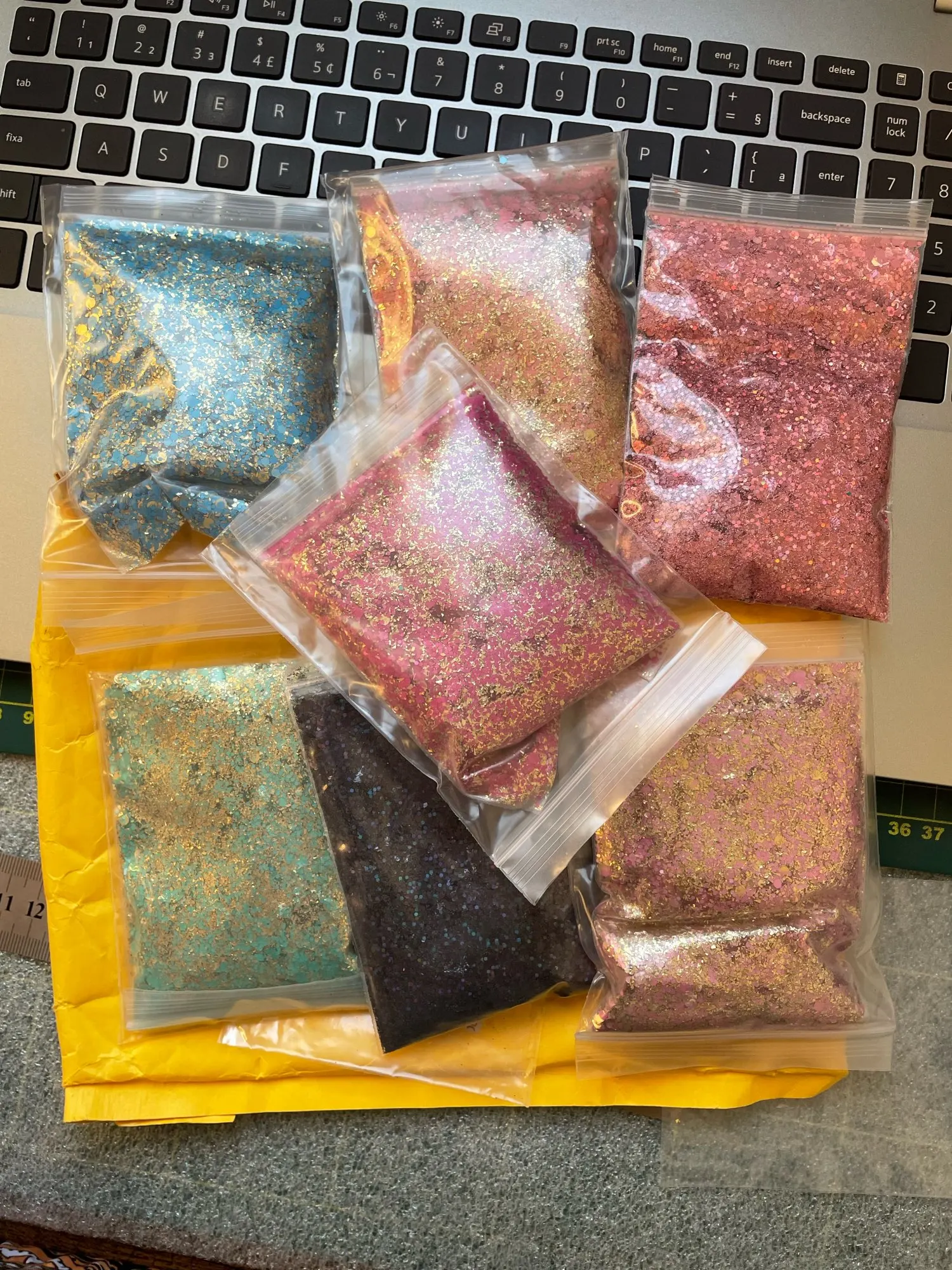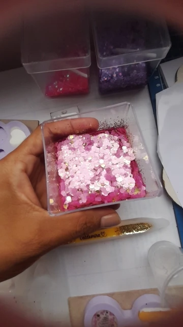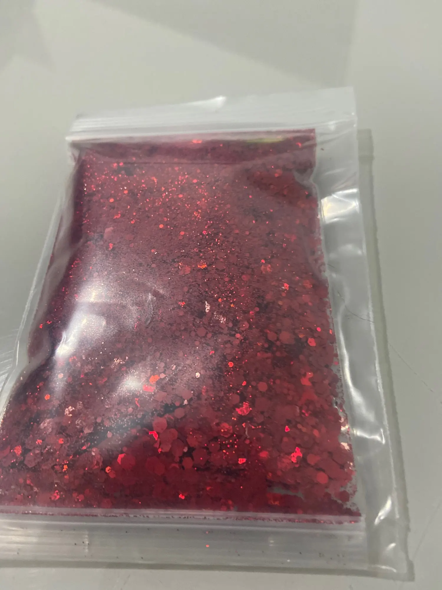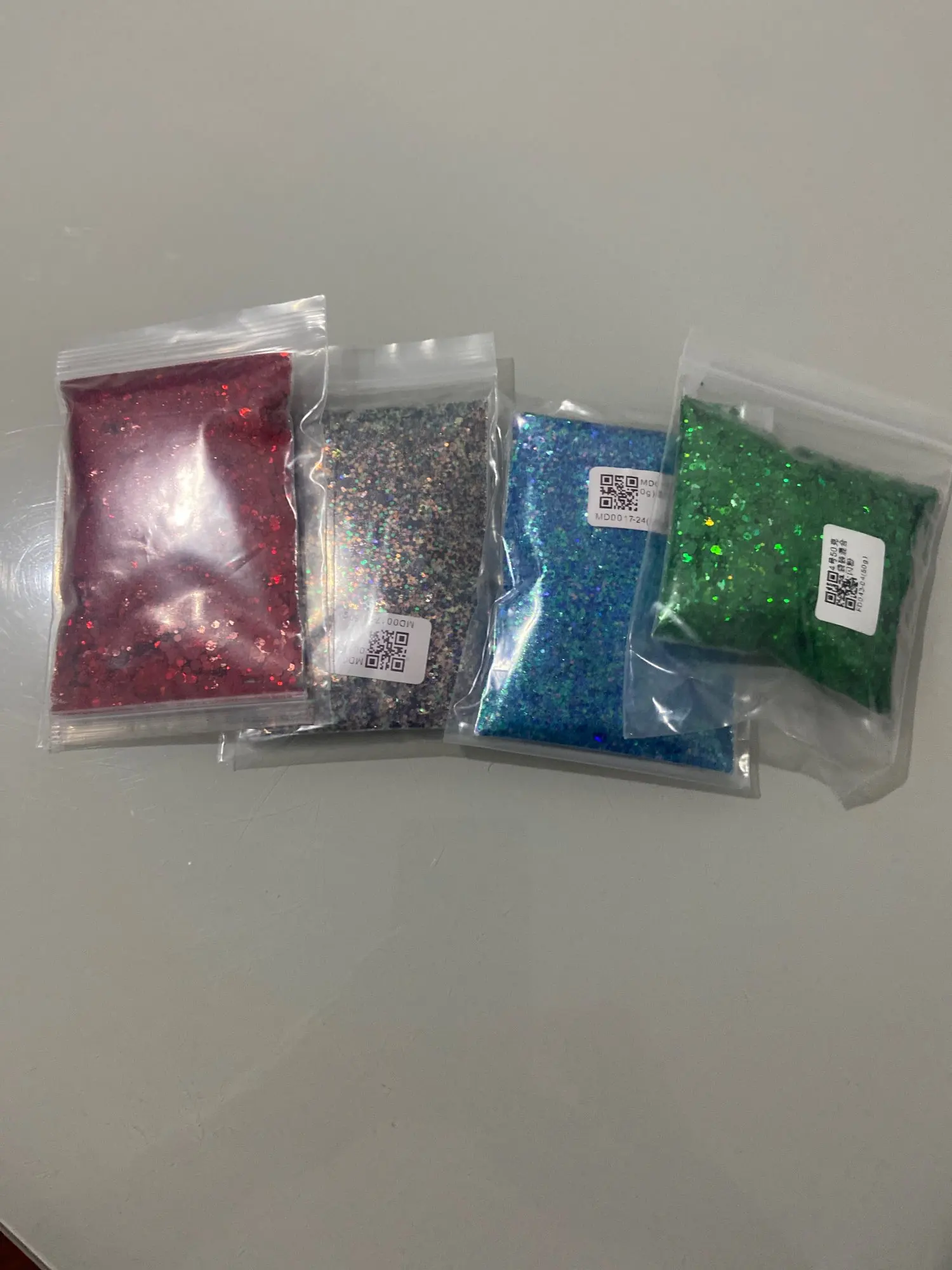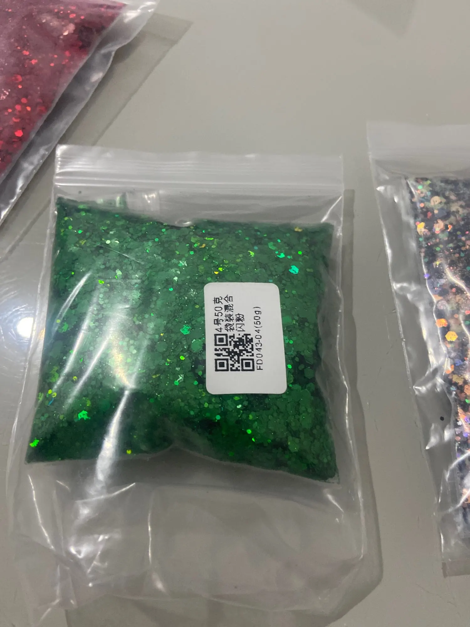 I love this glitter so much, it has different shapes in this mix which is super fun. It’s good with a green tinge. All different sizes of glitter. Received glitter in about 2-3 weeks