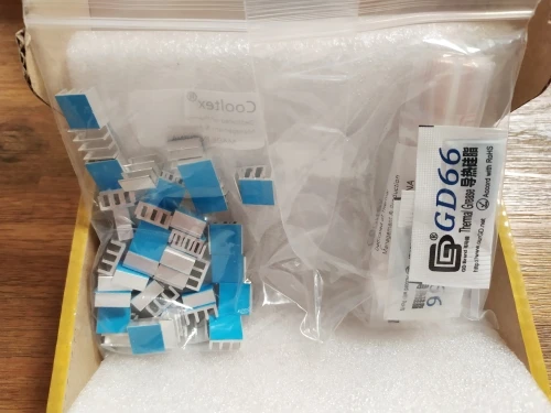 heatsinks basically bonded with thermal tapes and color is bare aluminium not blue, so I like it more than picture. cool. fast delivery, well packed, all I wanted. Excellent.