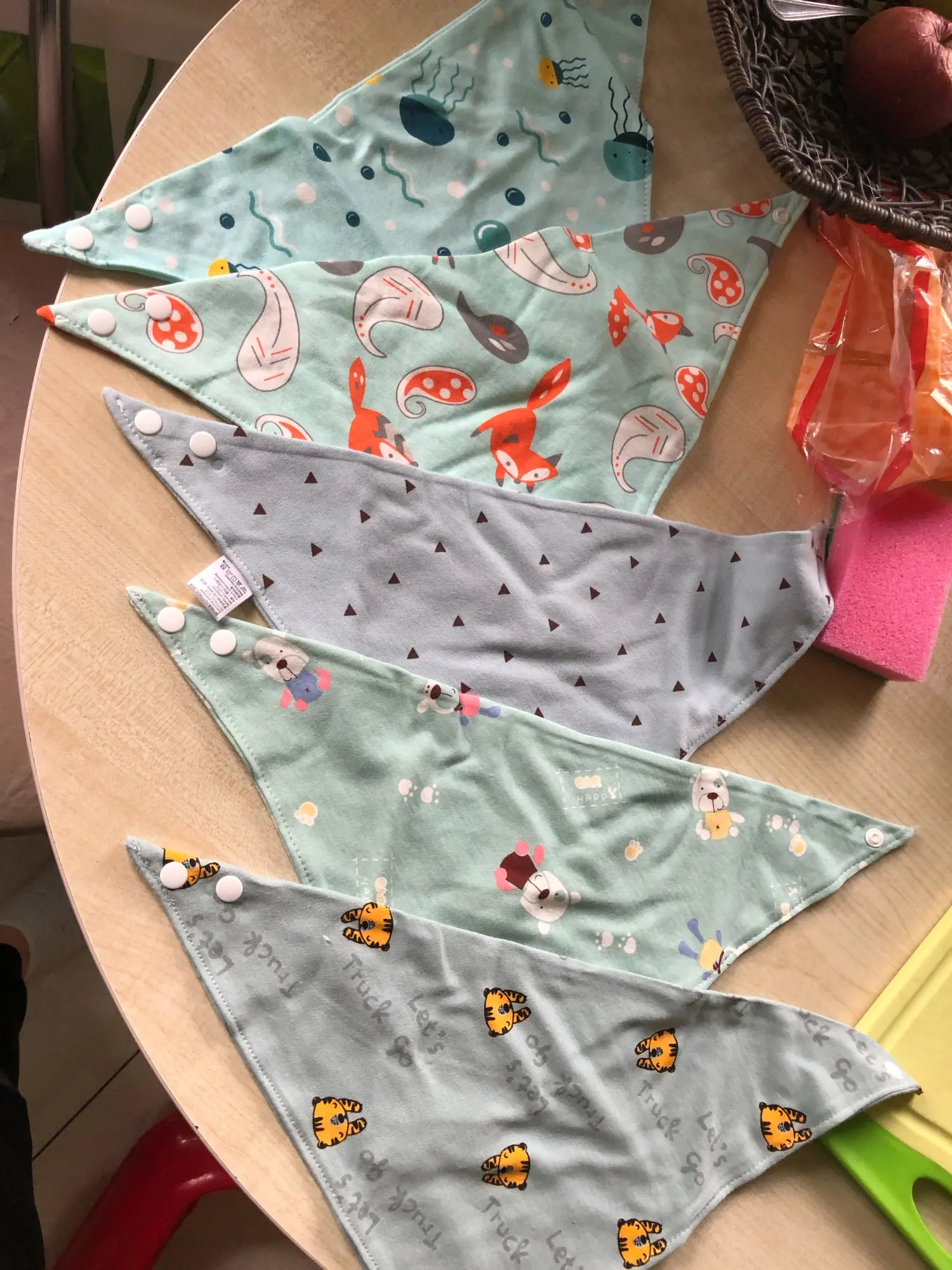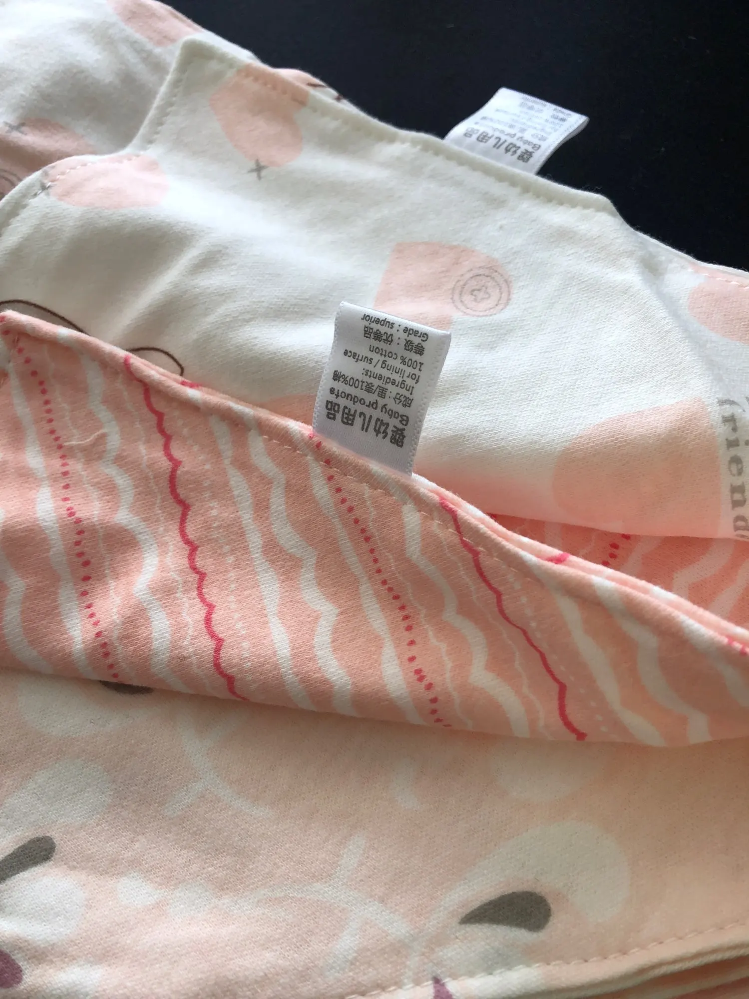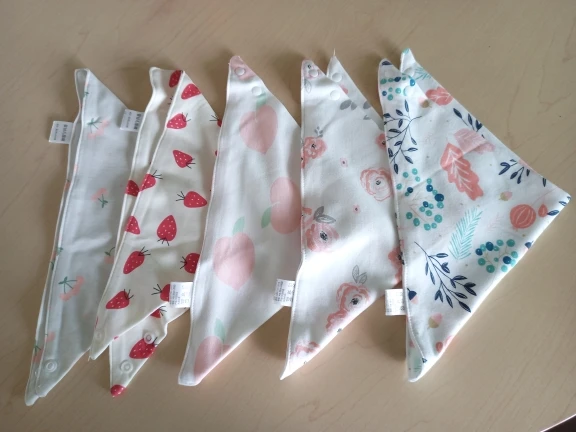 Very soft material. Unfortunately, I am a bit sad, because one of the item is not the same as I have ordered it. I should get white/black baby bib with clouds, instead of it I got yellow/blue penguins. :( I got them after 10 weeks.