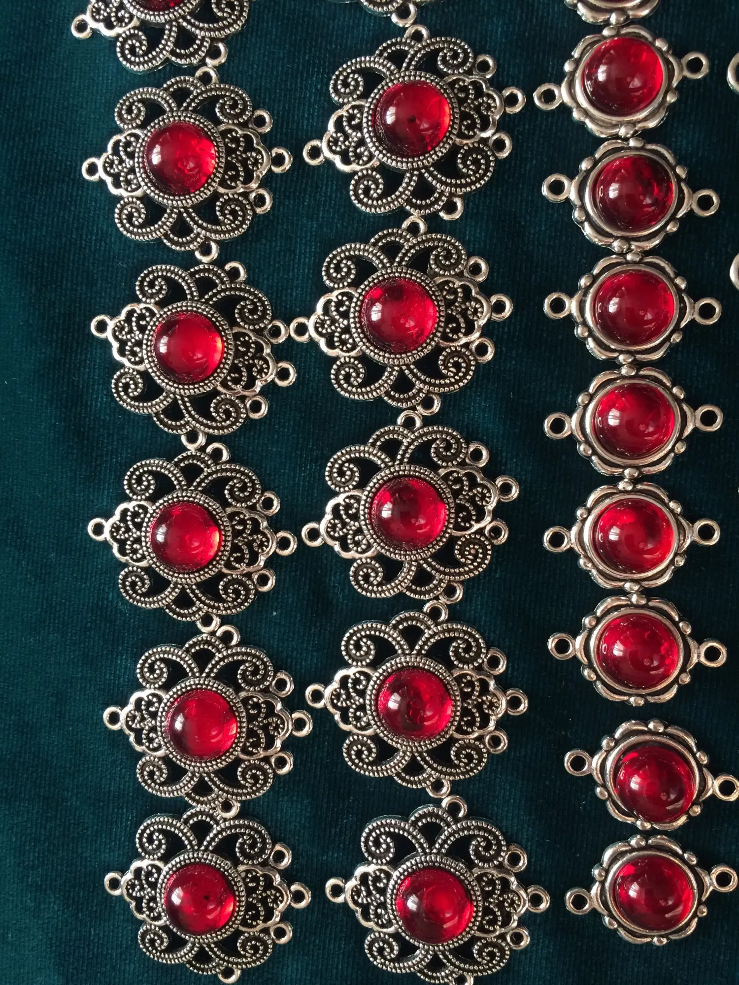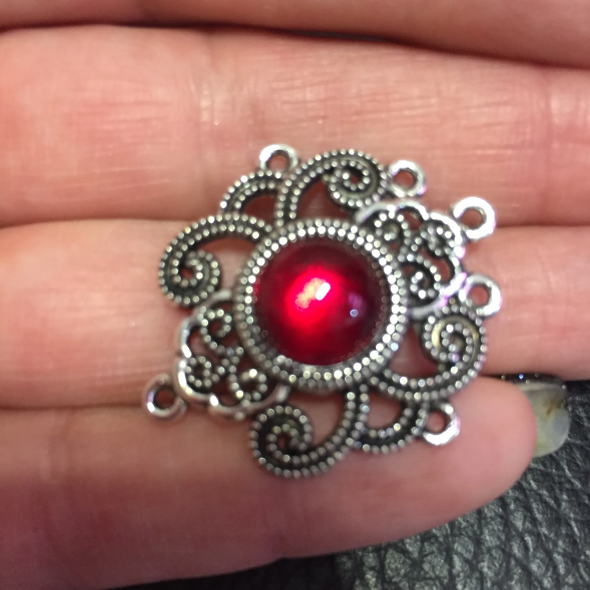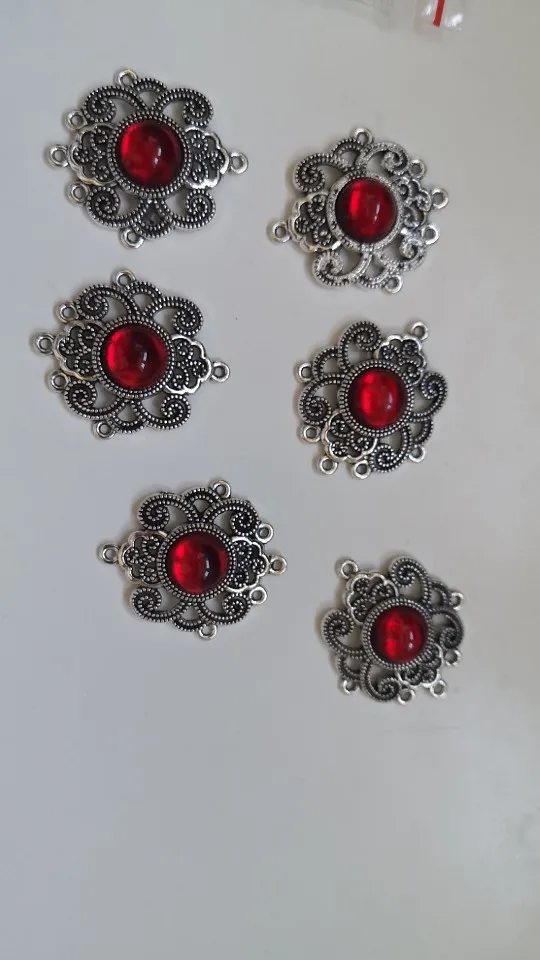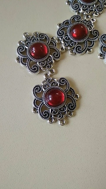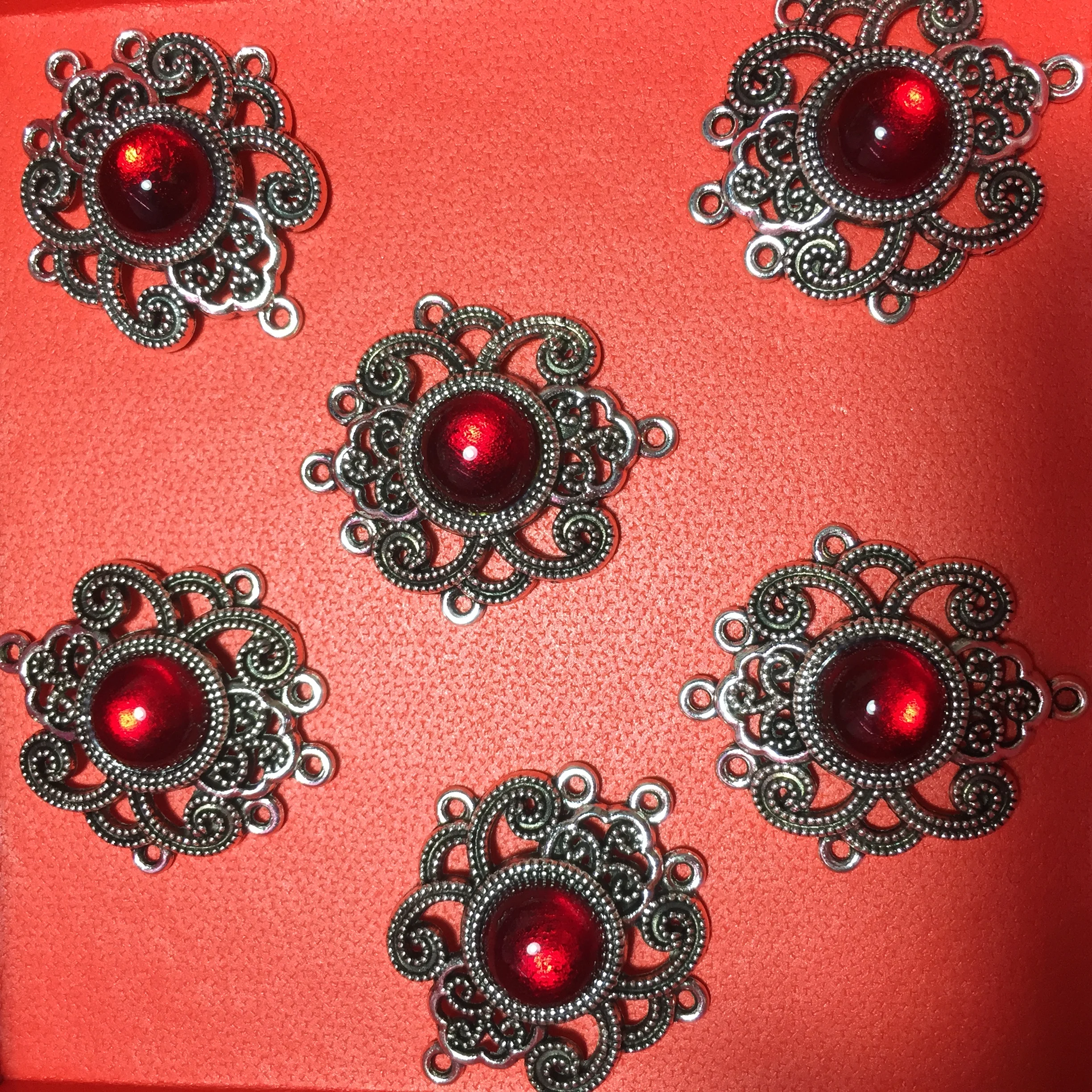 5Pcs Tibetan Silver Tone Flower Round Red Glaze Charms Connectors 27.5x31.5mm