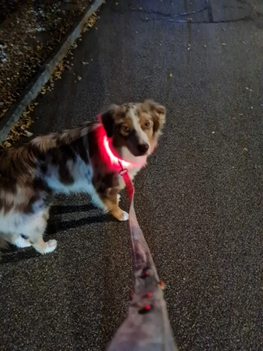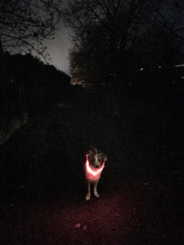 The 70 cm fits a BIG dog. I initially ordered a 50cm but that did not fit. The battery last fairly long and the light is very visible. The product did arrive fast but there was no tracking info. Caught by surprise.