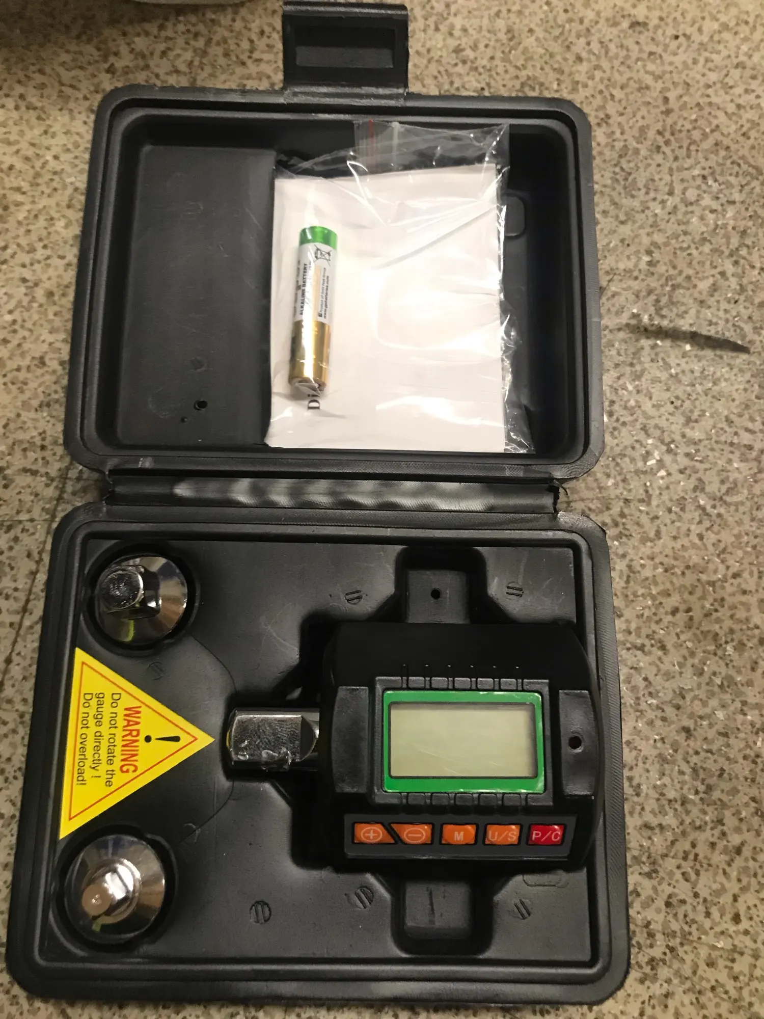 Arrived in 23 days. Well packed in bubble wrap. I thought backlight was not working but it only lights up when you apply torque. Uses two AA batteries. Good english instructions. Body approx 51mm dia. x 55mm long.
