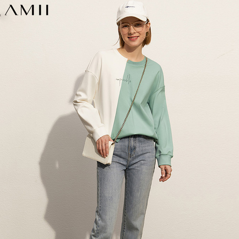 Amii Minimalism Spring Summer Fashion Sweatshirt Women Patchwork Oneck Embroidery Loose Hoodie Women Pullover Tops 12120066