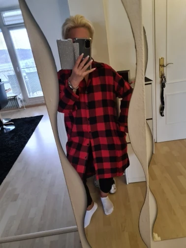 Item arrived super quick, I was impressed! The fannel is quite thin, but I don’t mind as I’m a quite warm blooded person. The overall stitching looks good. Unfortunately they missed a seam in the pockets (it had pockets, yay!!). As I am quite tall (1.83 m), it is not as long on me as on the model. Also the sleeves are a bit short. I don’t mind, it is overall still long enough to wear with a legging. As for the sleeves, I always wear them rolled up anyways.