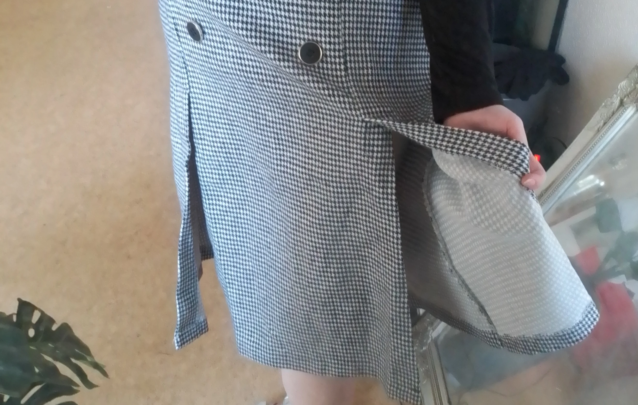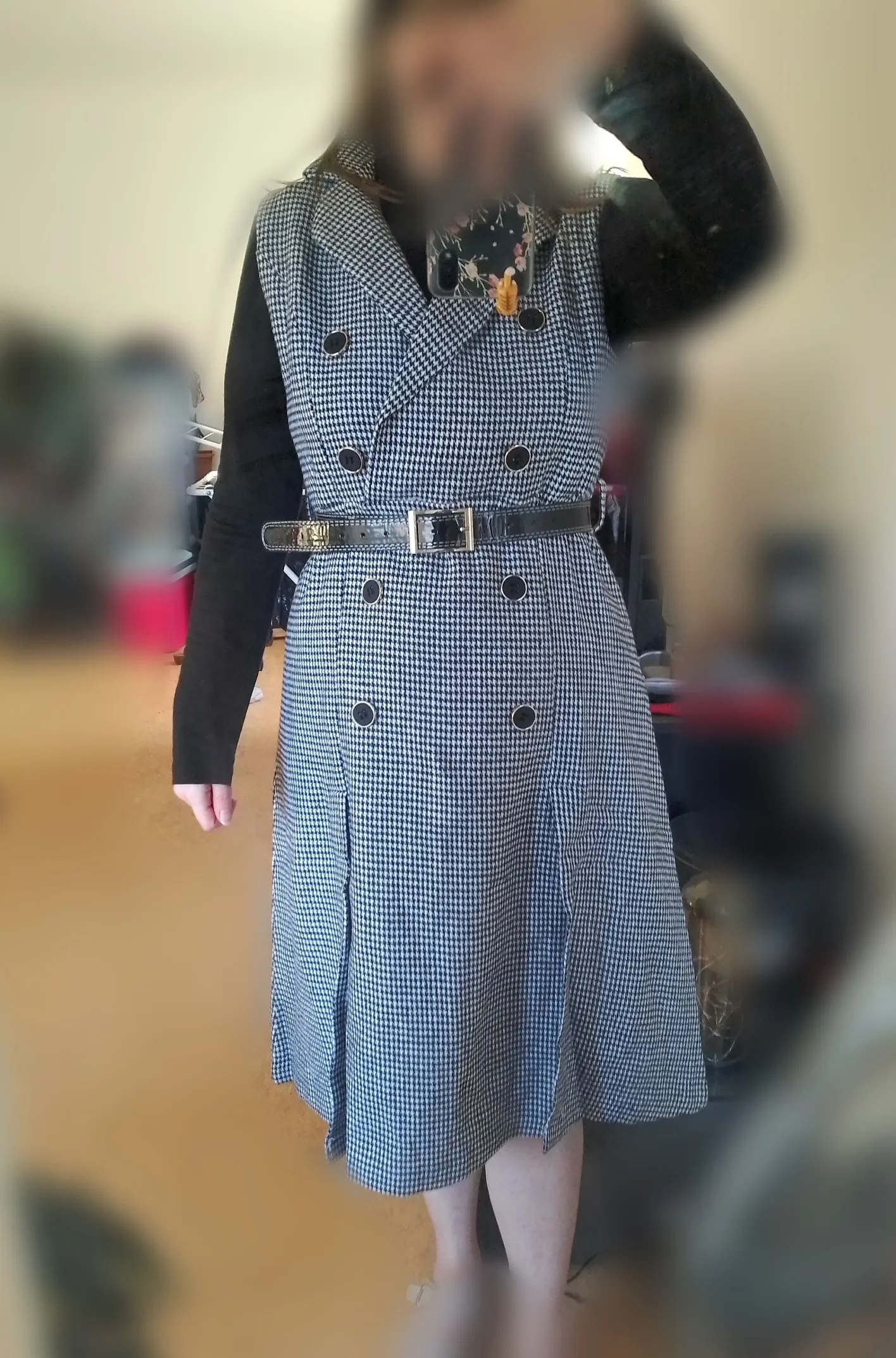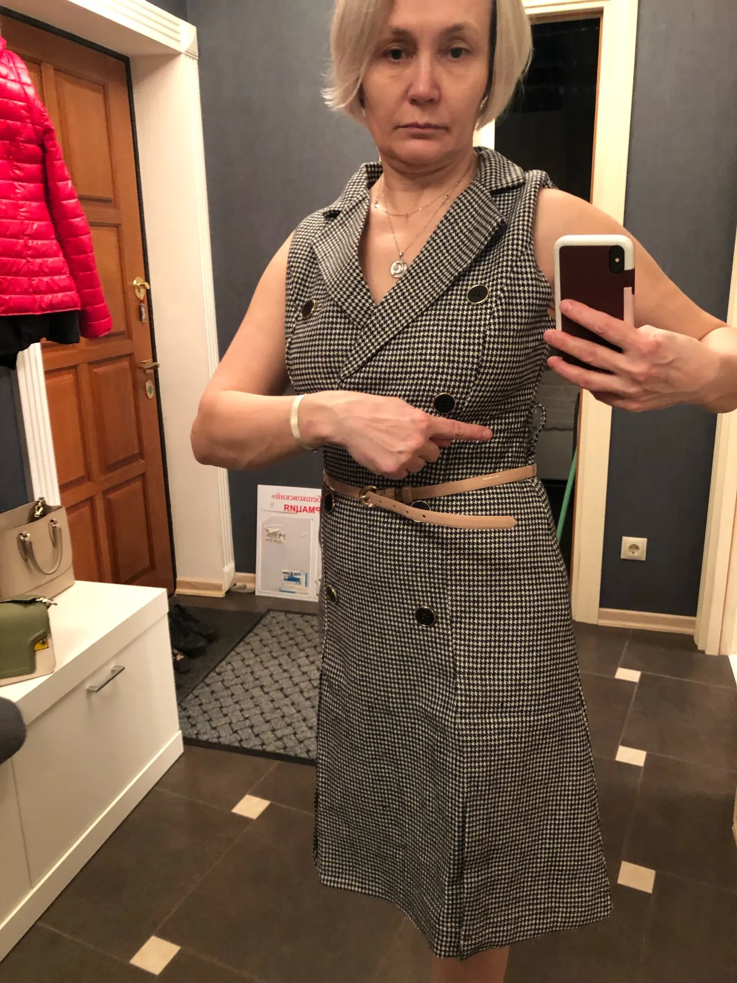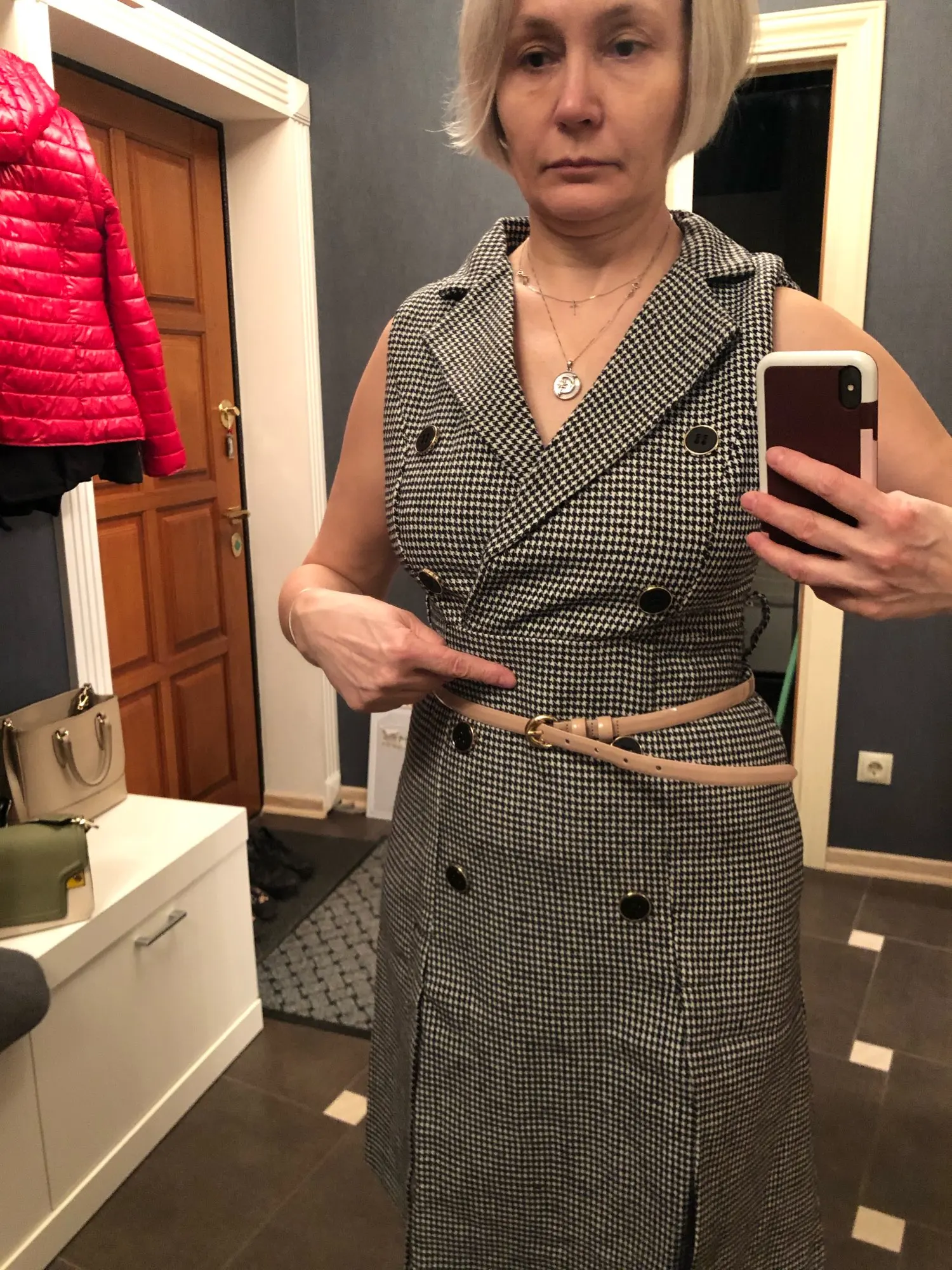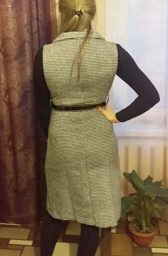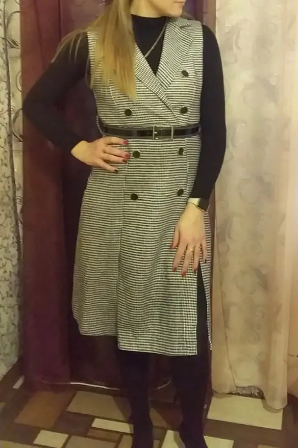 Autumn Winter Women Houndstooth Sleeveless Notched Collar Double-Breasted Split Office Tweed Plaid Midi Dress With Belted Top