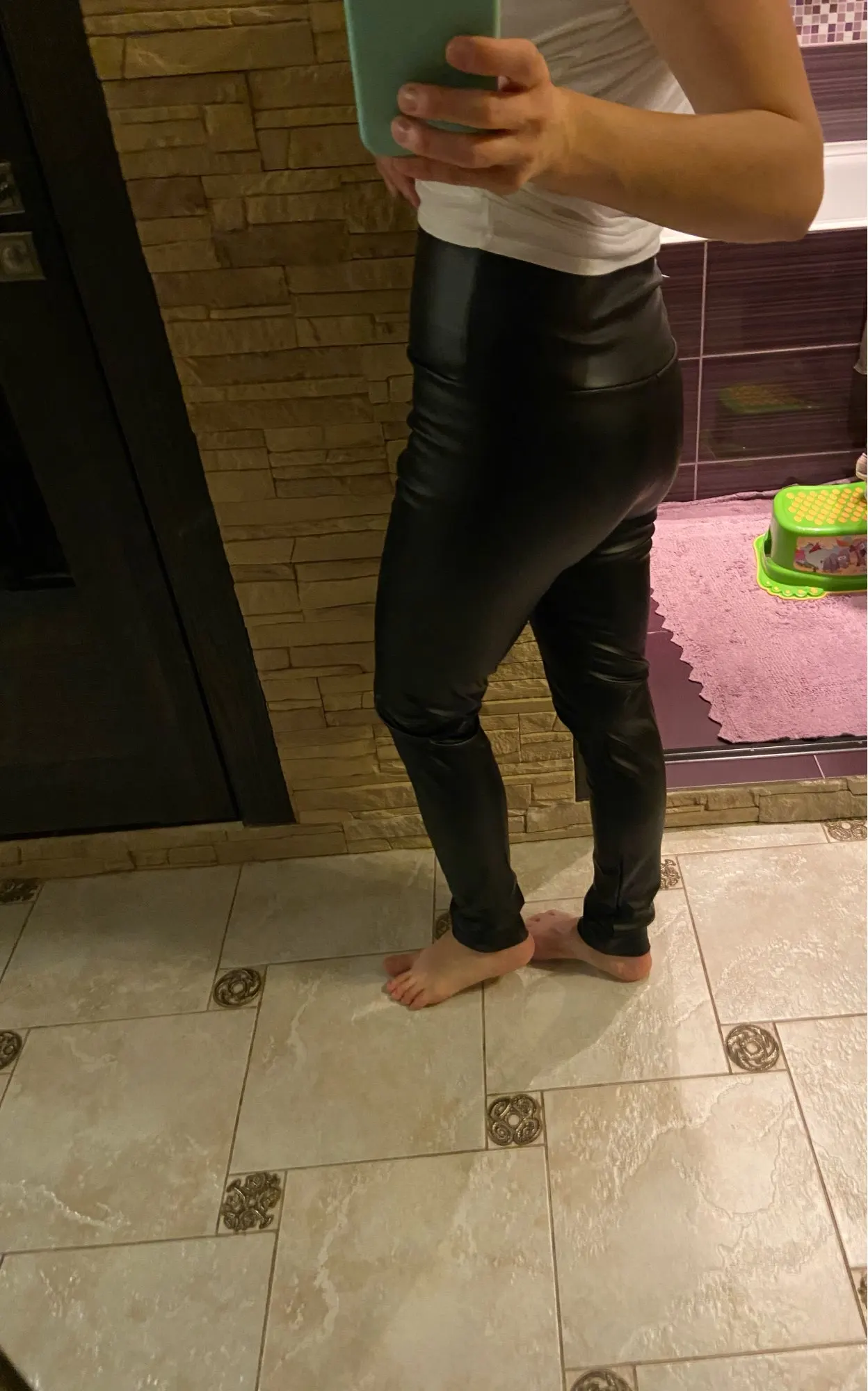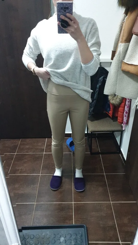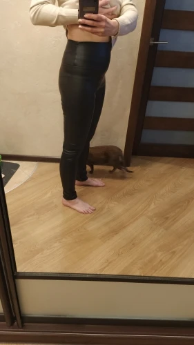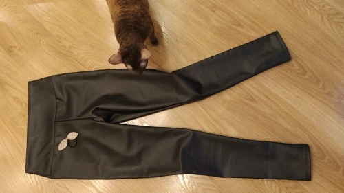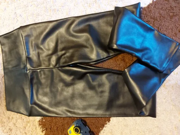 After washing, when it’s wet it still has a strong chemical fishy smell, which will lessen after leaving it out in open air for a day or two. Decently warm, the PU leather is waterproof so water will turn to droplets. Stretchy and shiny.