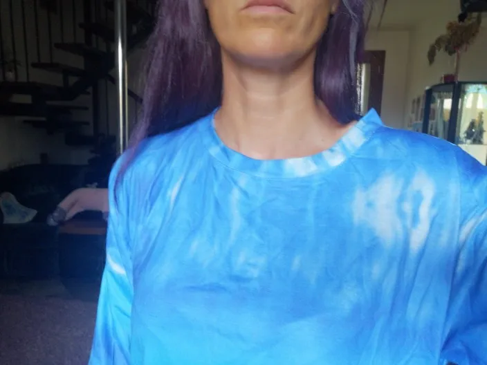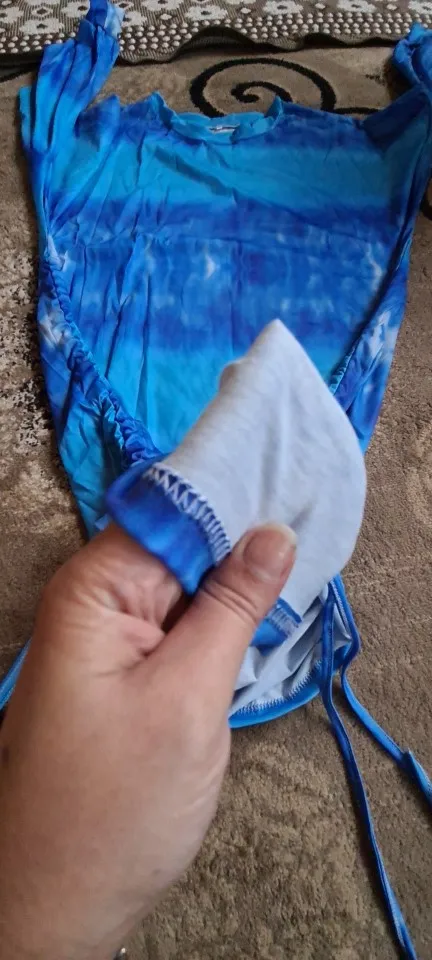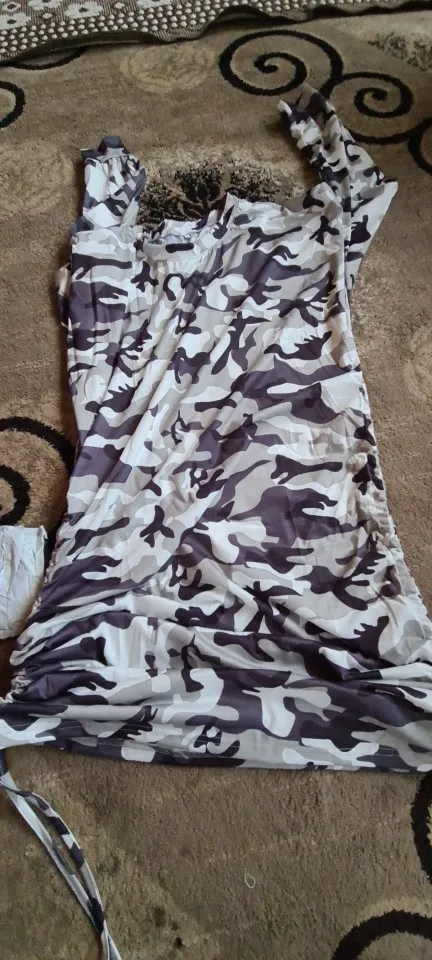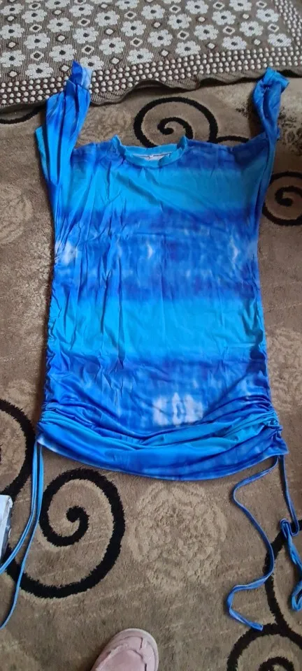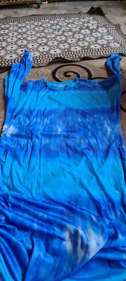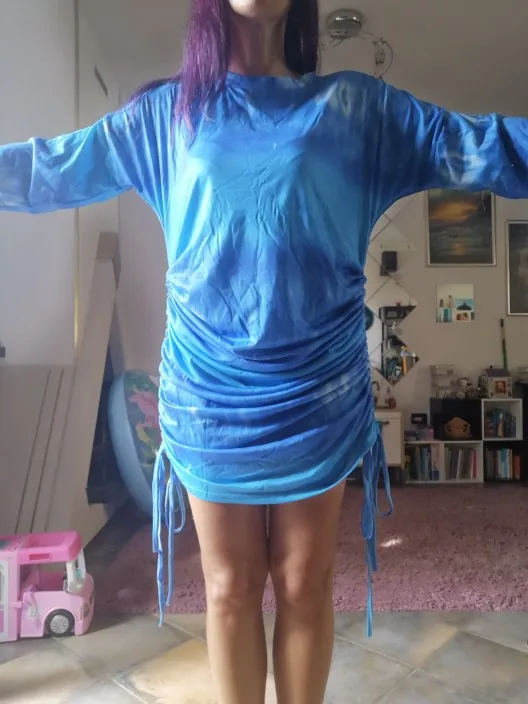 This dress is huge! When it's not drawn up, it's almost down to my feet. When it is drawn up, there is so much fabric bunched around my belly that it looks ridiculous. With as big as it is, though, I'm not getting the off-the-shoulder look. The neckline is just sort of stretched-out-sweatshirt, not off-the-shoulder. Lastly, the fabric is very thin--I was expecting a true sweatshirt material.
