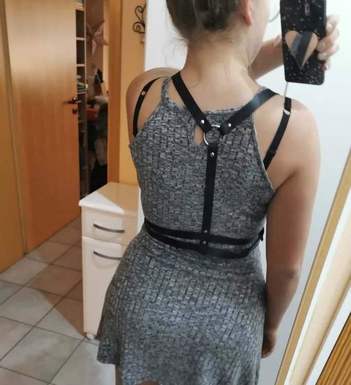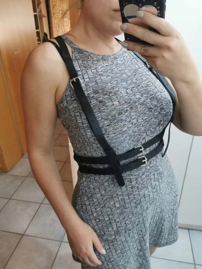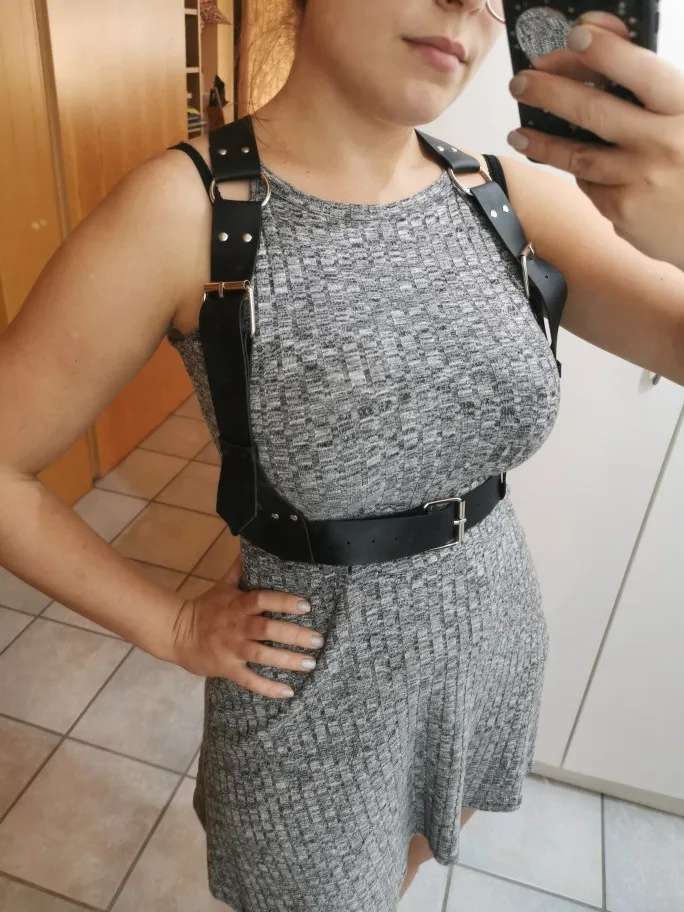 Very sexy harness. Though even at the smallest size, it's waaay to big for a petite girl with a waist of 62 cm. It wasn't a problem for us, since I'm pretty handy at changing the size of the straps. It could prove to be a problem for slim girls who want to wear it without having to make careful adjustments and reattachment of the straps.