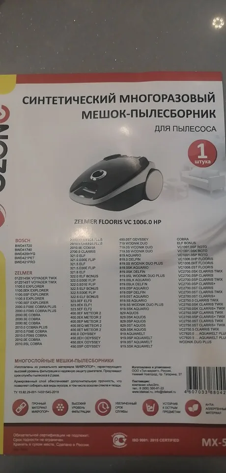 Bag for vacuum cleaner reusable. Suitable Zelmer, bag type: 2700, 2010, 2000, 2000, 1100, 919, 828, 818, 450, 400. 1 PCs