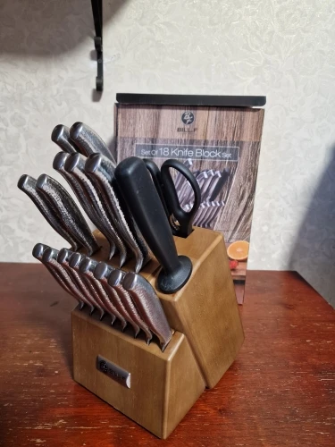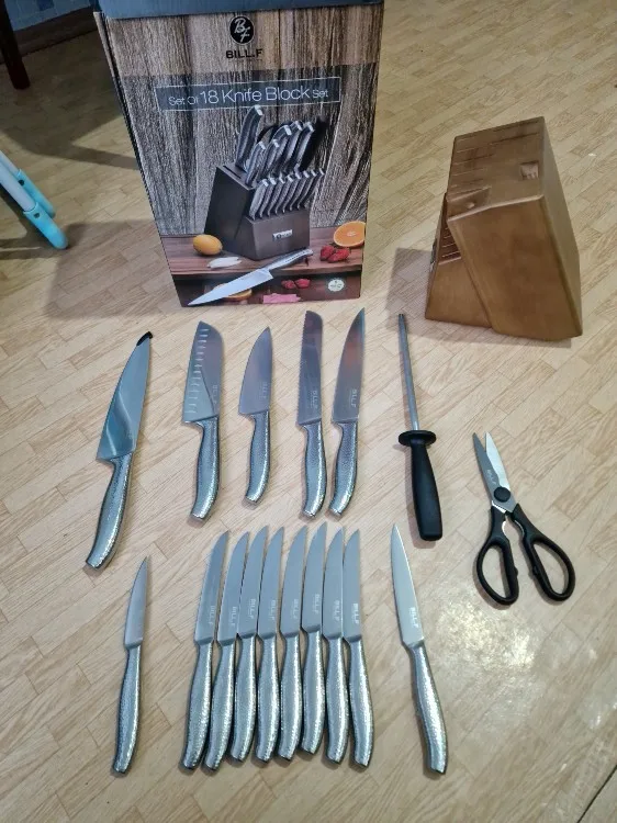 BILL.F Kitchen Knife Set 18 Pieces Knife Set with Wooden Block and Sharpener, Stainless Steel Kitchen Knives and Scissors Bloc