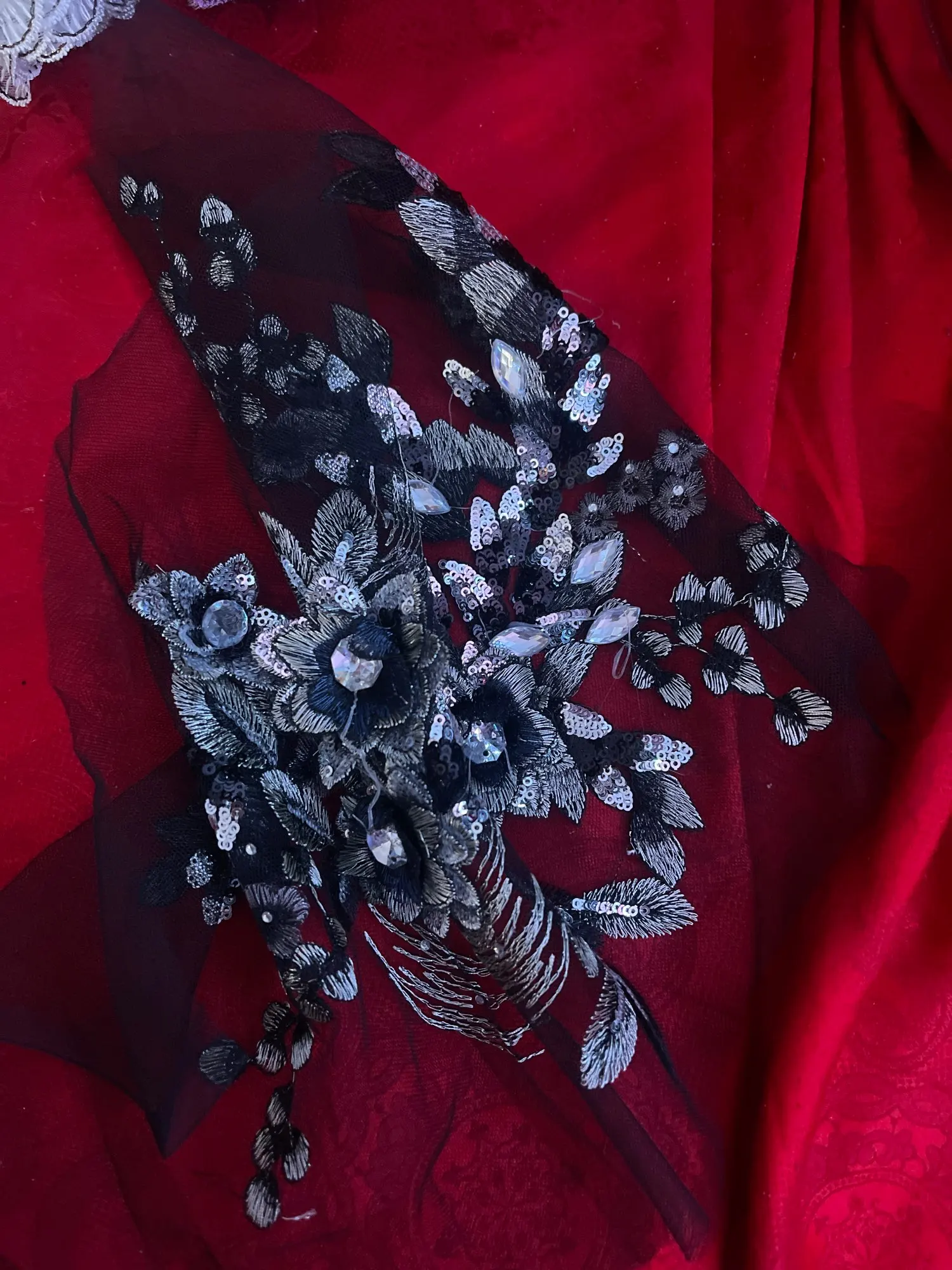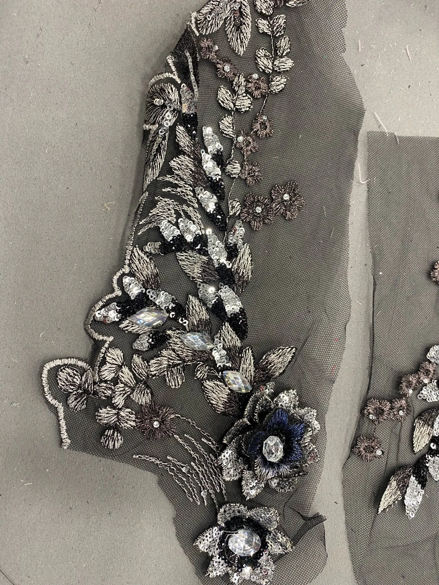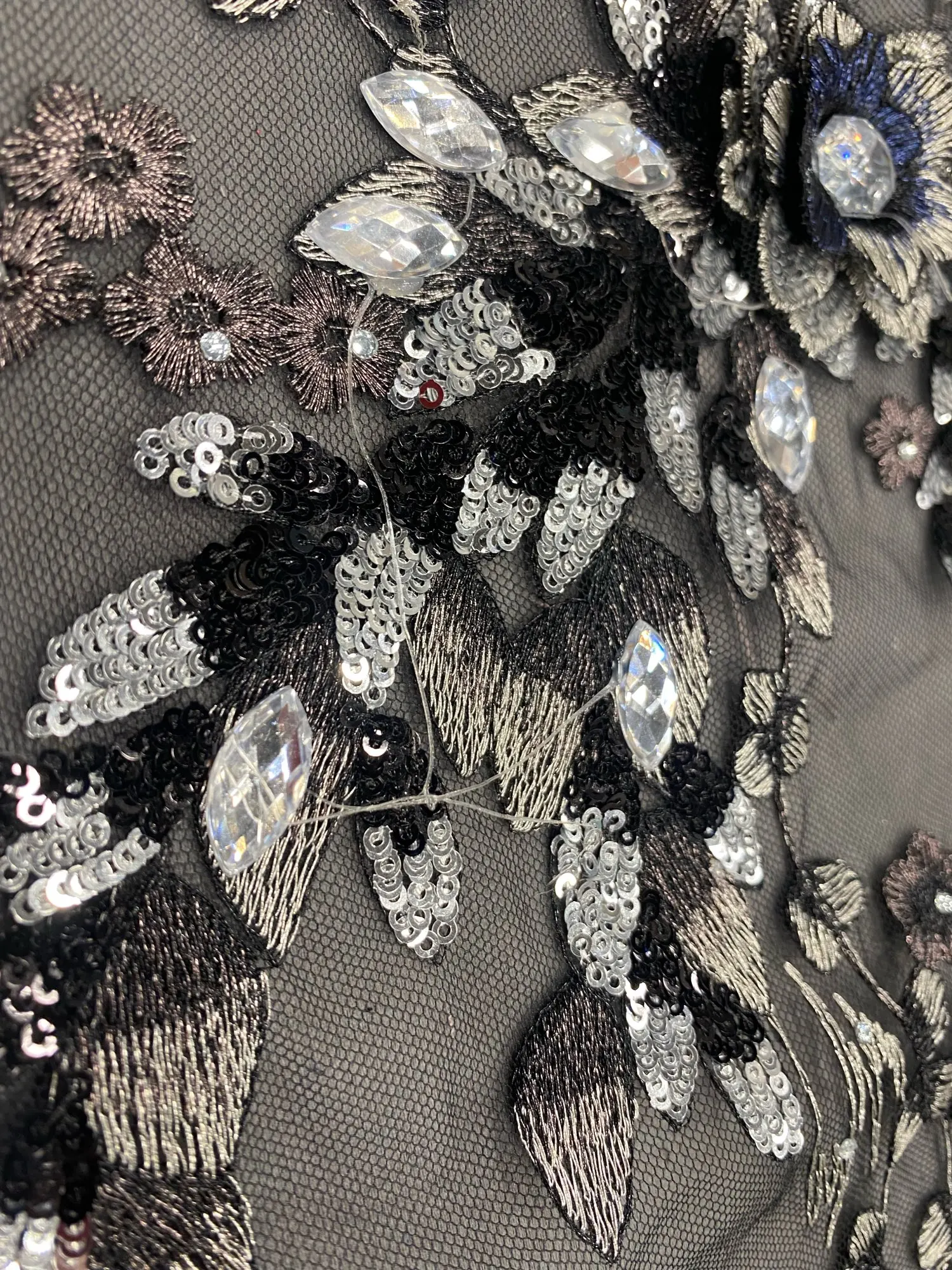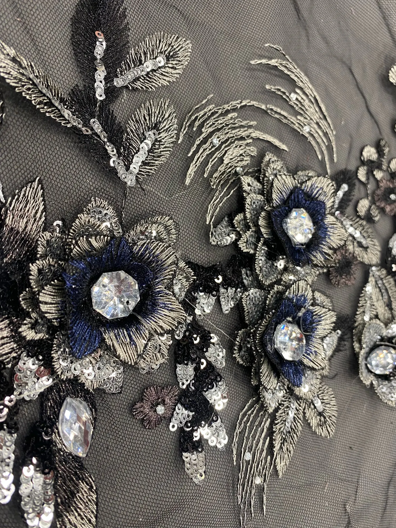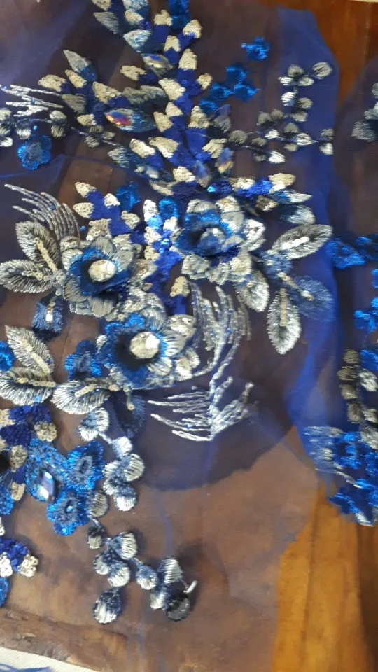 Black Blue Fabric 3D Flowers Beads Sequins Rhinestone Appliques Embroidery Lace Trims Mesh Sew On Patch For Wedding Dress DIY