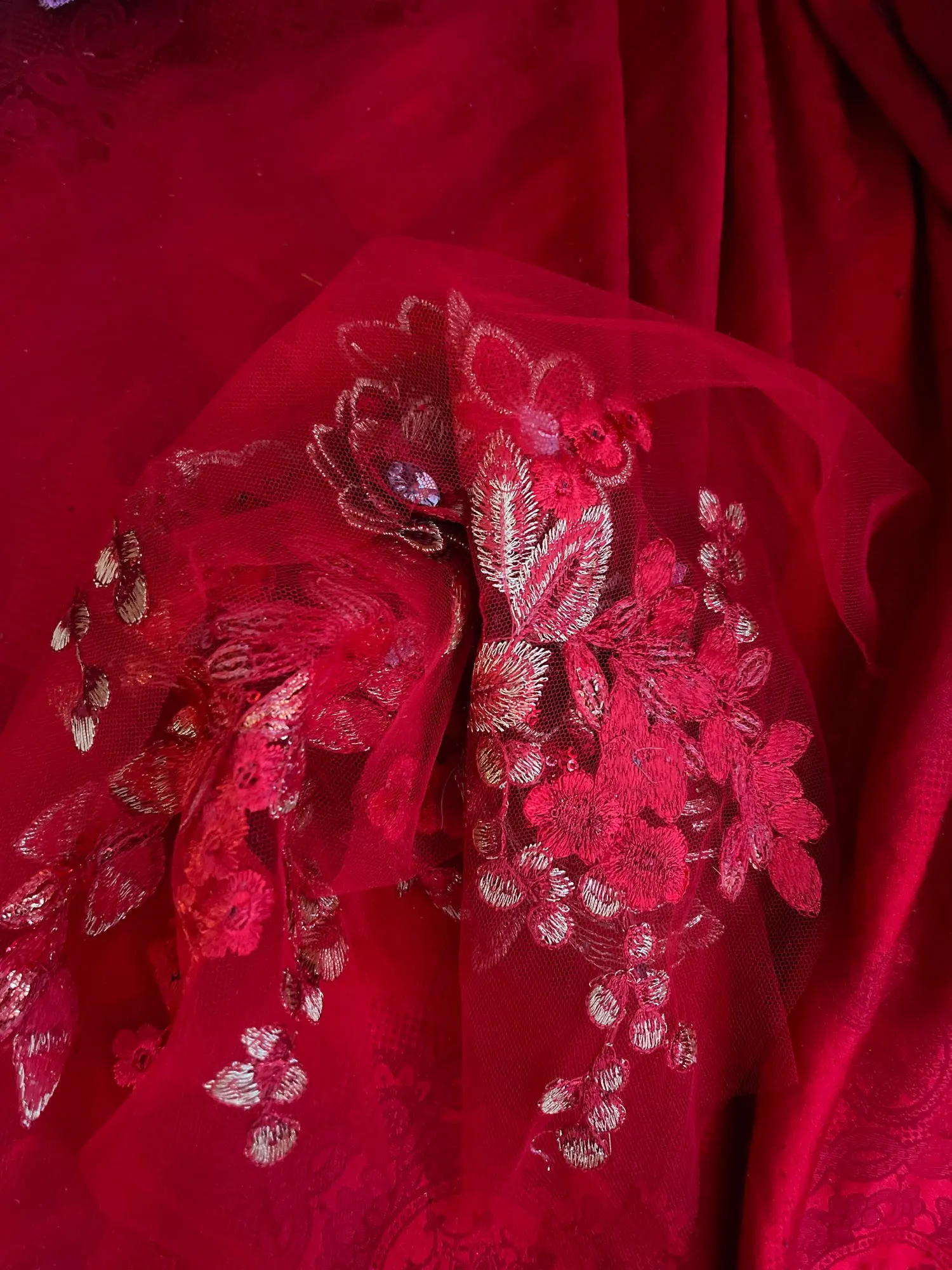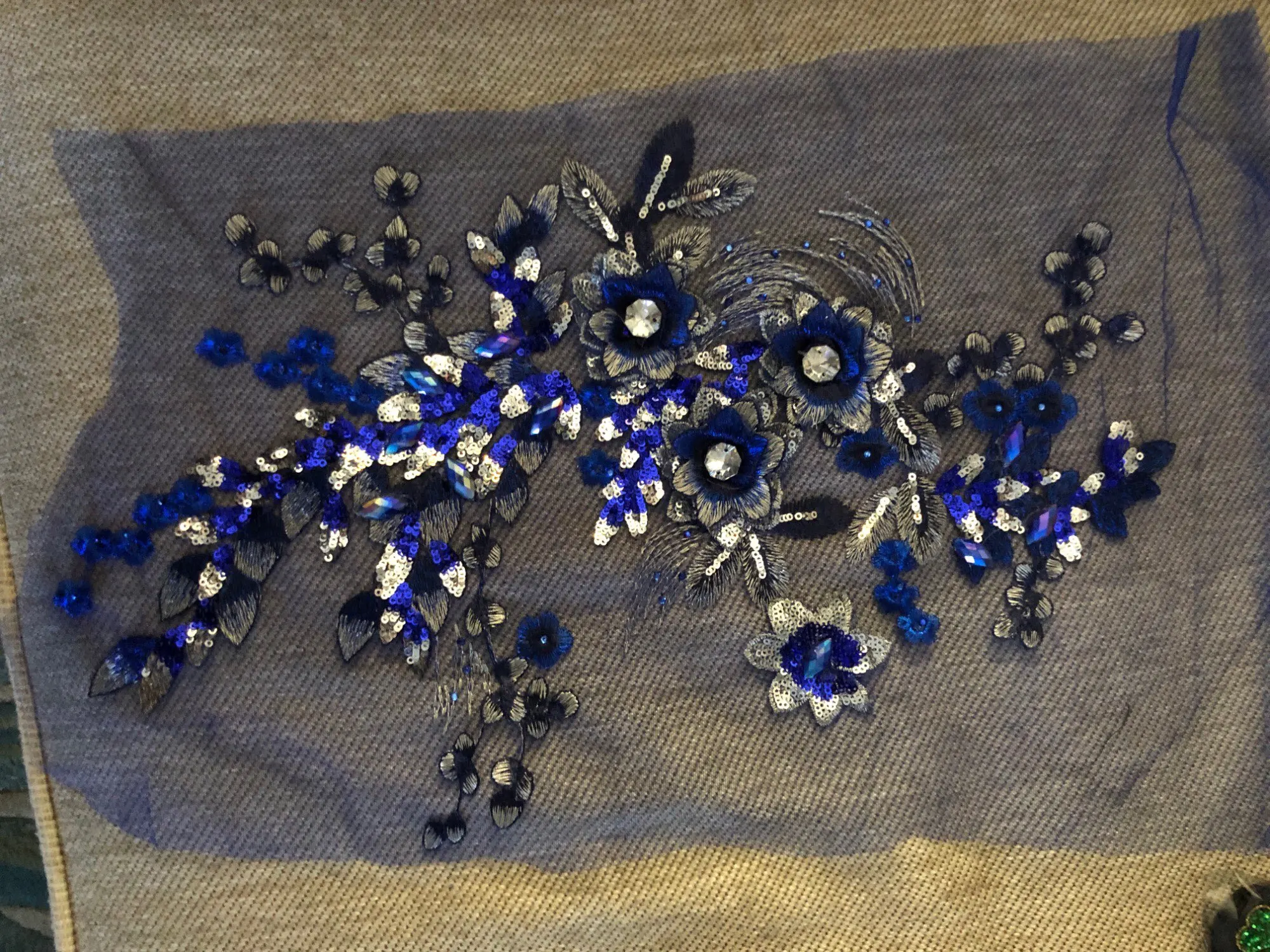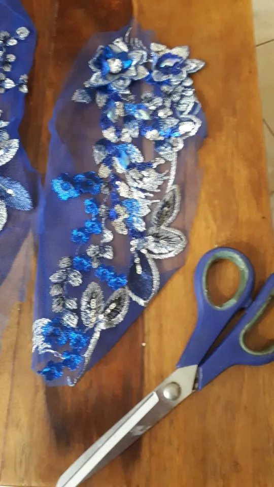 vibrant blue colour lace with 3D flowers and lots of rhinestones.