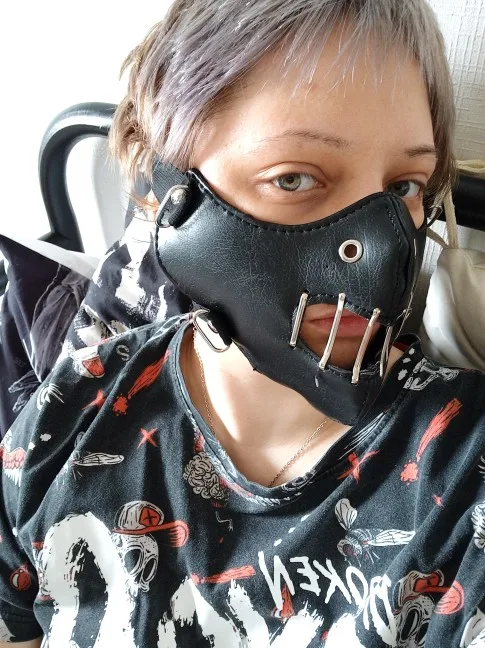 It's a big mask to a woman's face.