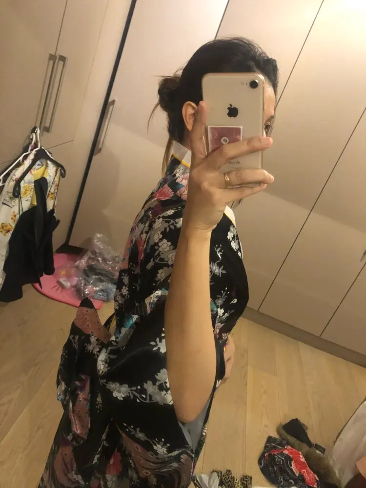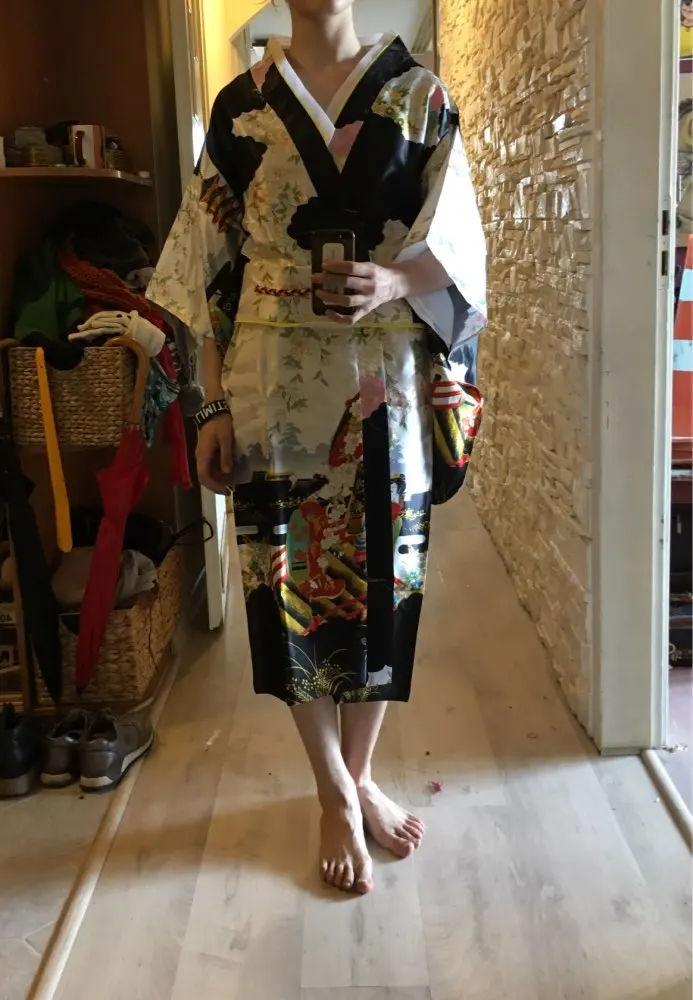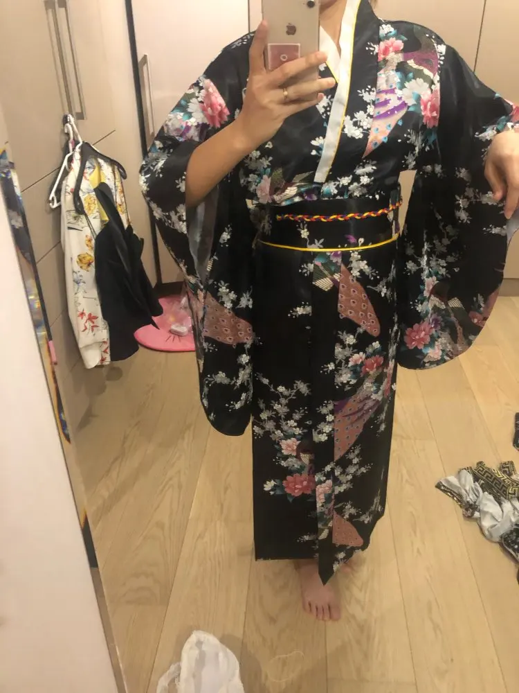 Black Woman Lady Japanese Tradition Yukata Kimono Bath Robe Gown With Obi Flower Vintage Evening Party Dress Cosplay Costume