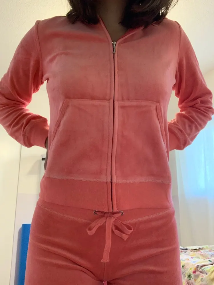 It’s ok. It’s nothing near the quality of actual juicy. `The velvet is not soft like the real thing. It’s great for the money but if you are actually trying to pass it off as Juicy, don’t . Just buy if you like the outfit. The size is way smaller than juicy too obviously. I’m a UK 8 and the large is quite neat on the thighs. The jacket is also quite short on my body so if you want it loose and you are a size 8-10, get the XL I think. It’s pretty enough and worth the price in my opinion . Considering Juicy is £100/200 per outfit, its good value.