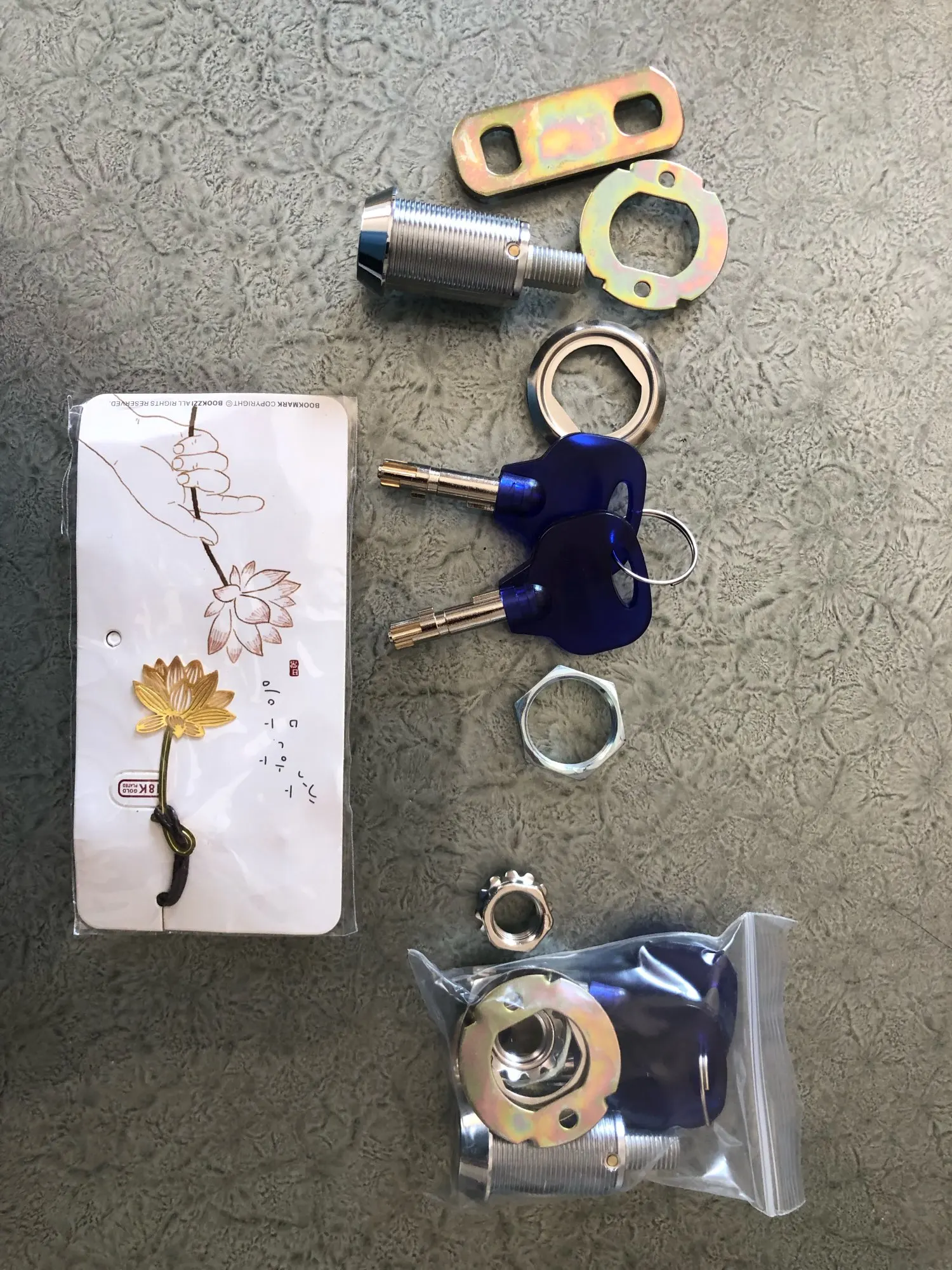 Interesting lock. I guess the structure is like a tubular lock (in Chinese, this is known as a ‘plum flower’ lock) but the pins are more hidden. Seller included a small gift — thanks!