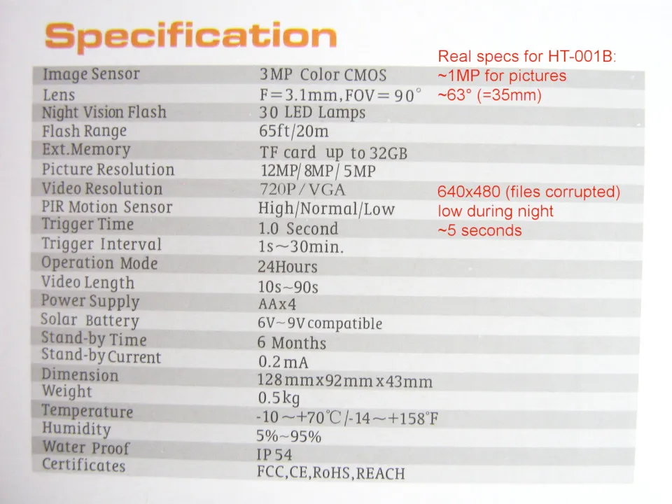 The HT-001B camera is too slow, has too low resolution to be usefull, is hard to operate and it's far away from the specs written in the description. It's a toy, not a trail cam. - Video can be used only with 640x480. 720 can be used, but files are corrupted, see example. And pictures have only 1 MP effective resolution. - motion trigger is very slow, the delay is around 5 seconds. And it's working only at daytime, during night the sensitivity is too low. - filming angle is only around 60°, which is to narrow for a trail cam. - operation is not easy and power switch is bad designed. You never know if the camera has started properly and is recording or not.