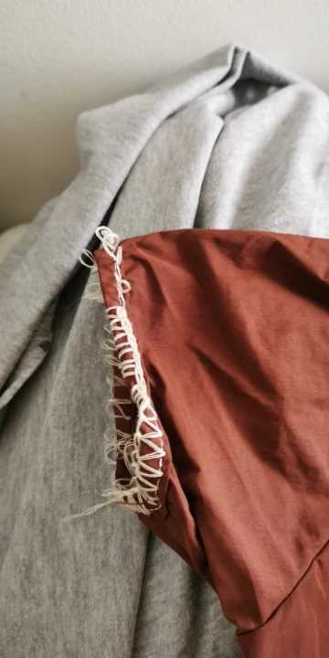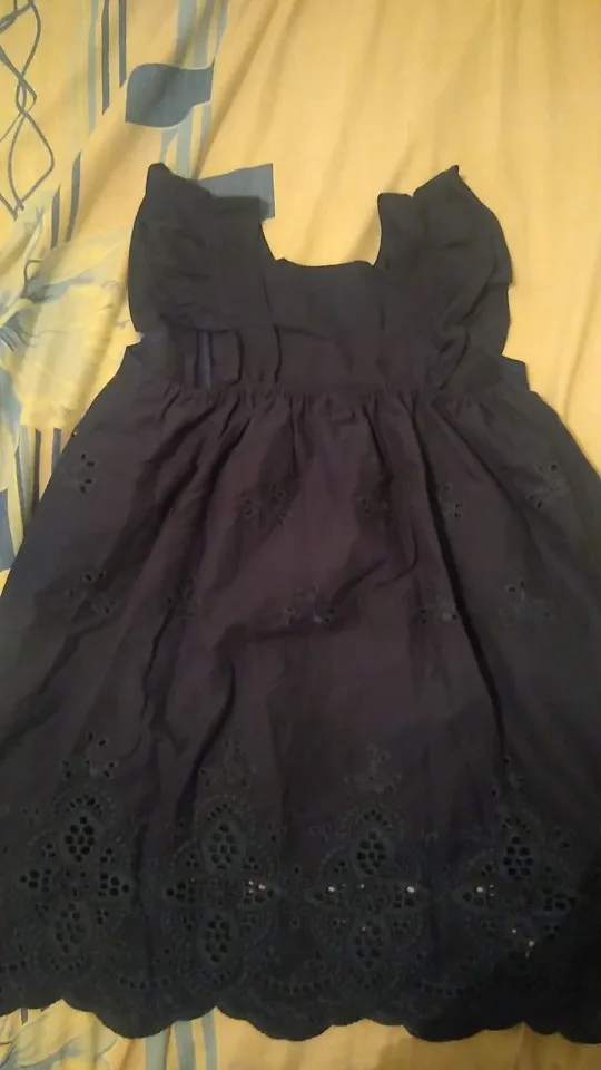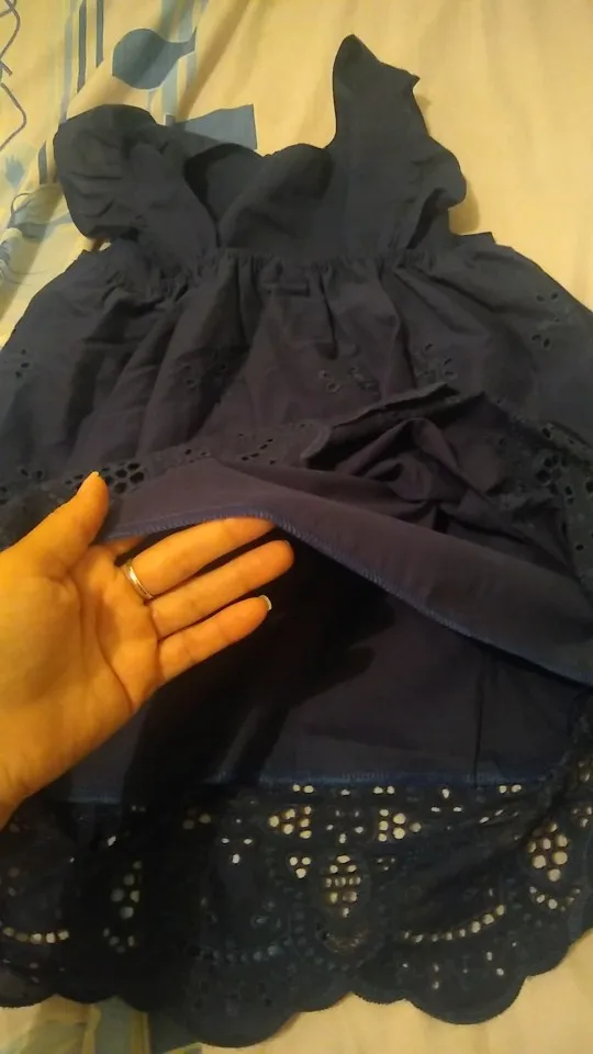 This dress is beautiful. It doesn’t feel like cotton, but feels sort of slippery. Arrived with a broken button and the buttons are very unique, so I will have to just replace all three since I probably can’t find one that matches.
