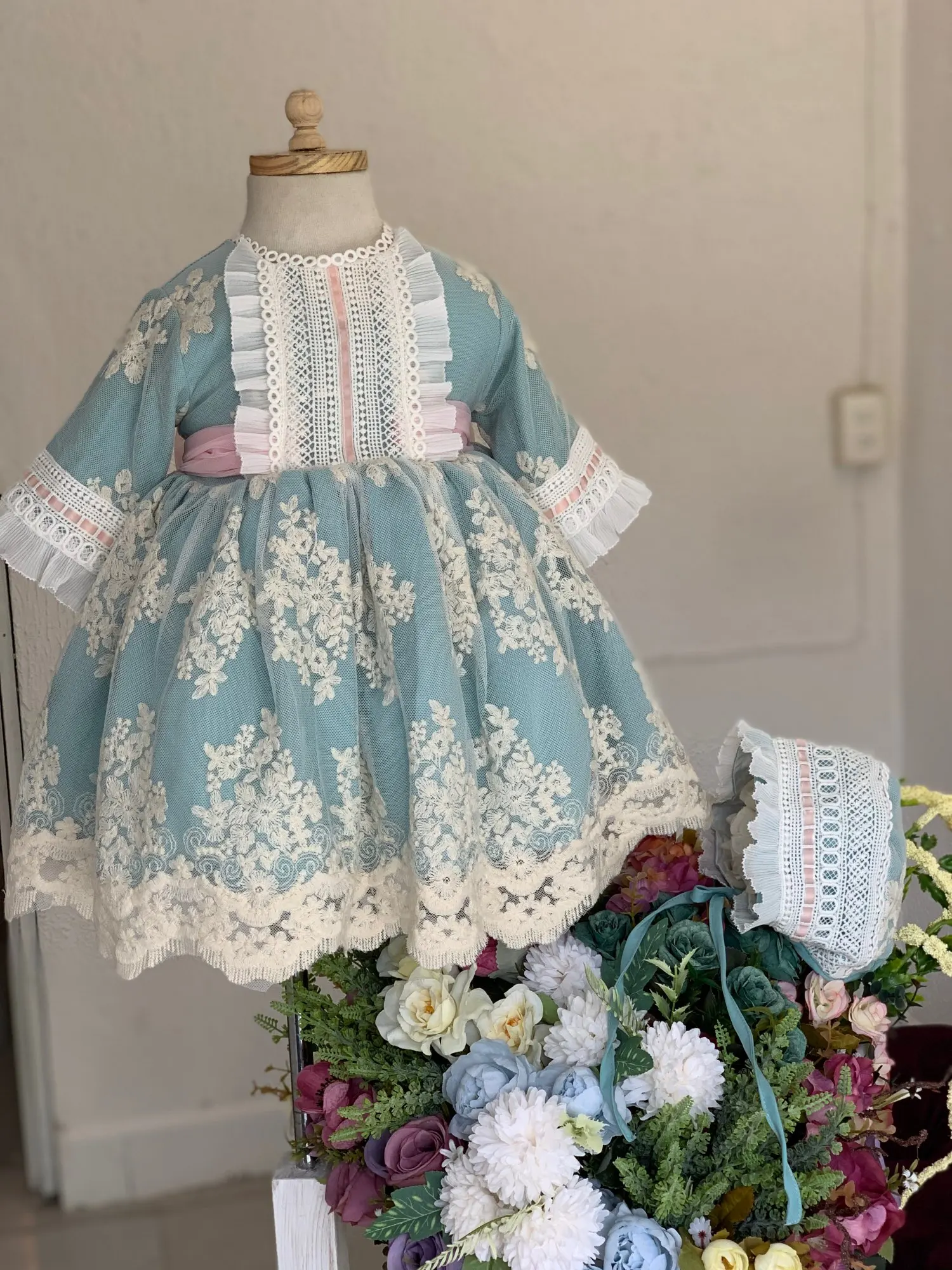 Children's Spanish Dressses Autumn Winter Girls Spain Lotia Dress With Bow Kids Long Sleeve Ball Gowns with Hat Baby Thick Frock