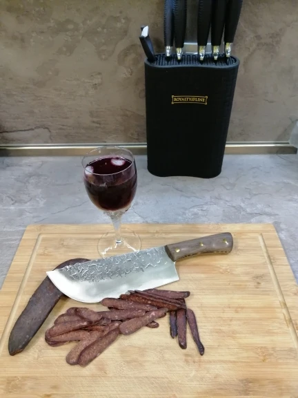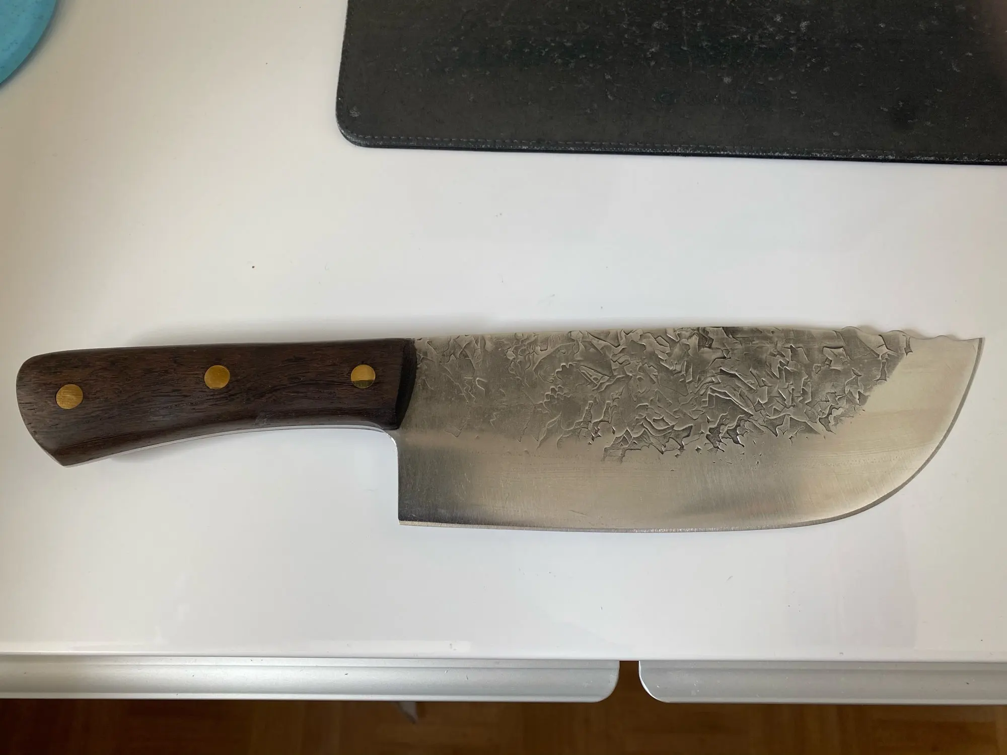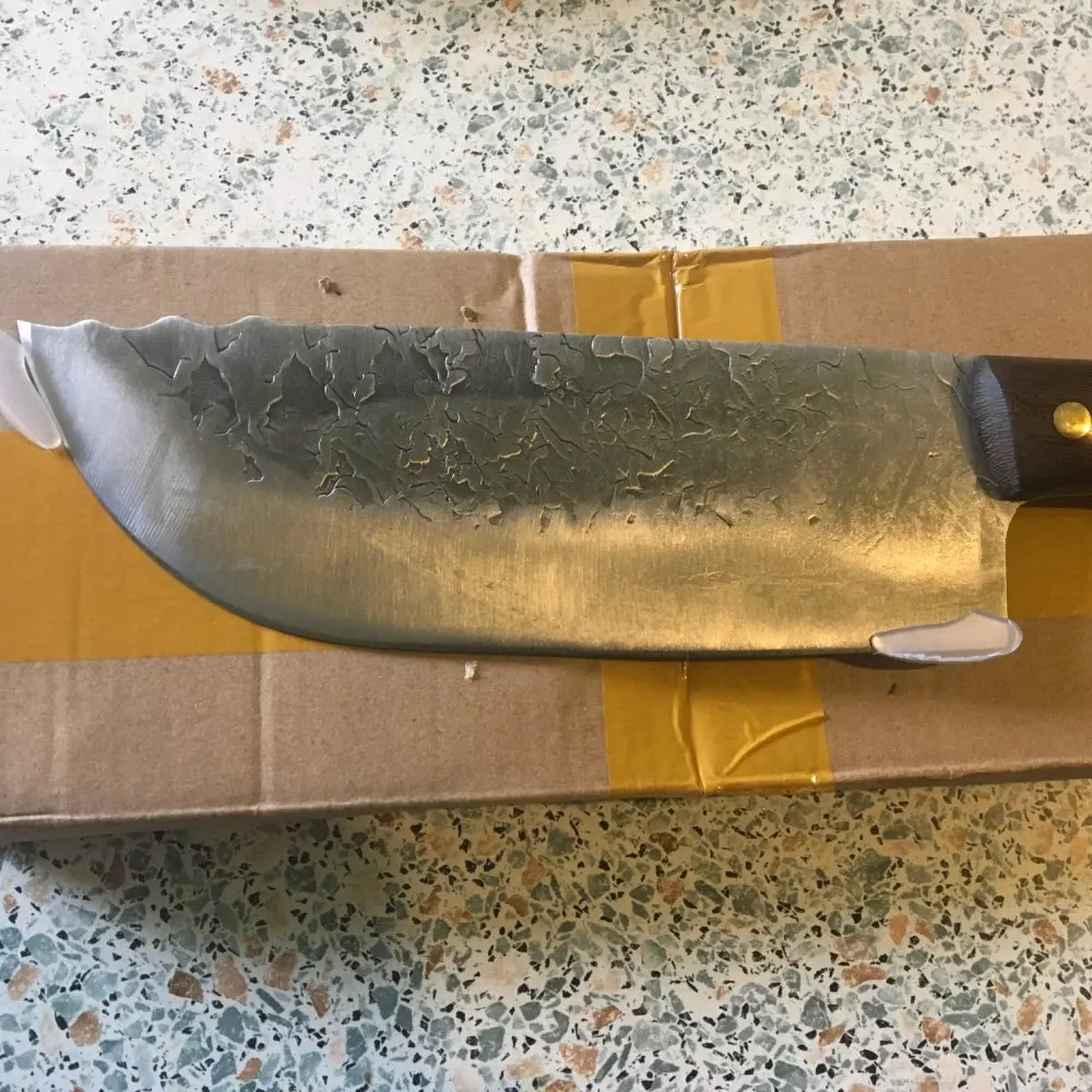 Beautiful looking knife. I bought this after buying the Serbian Cleaver style one off Amazon originally through a deal that made it cheaper than off Aliexpress. This one matches that one in looks as a set. The spine of blade on this is a bit thicker on this one though. This is designed as a front heavy veggie chopper. I have one issue with the design and that is the heel of the blade sweeps back and there isn't enough knuckle clearance to comfortably use this in a correct pinch grip style where the balance point is just past the handle on the blade. Still, it came sharp, well made, and I love the handle. Just wish the ergonomics was a bit better. May grind that off later.