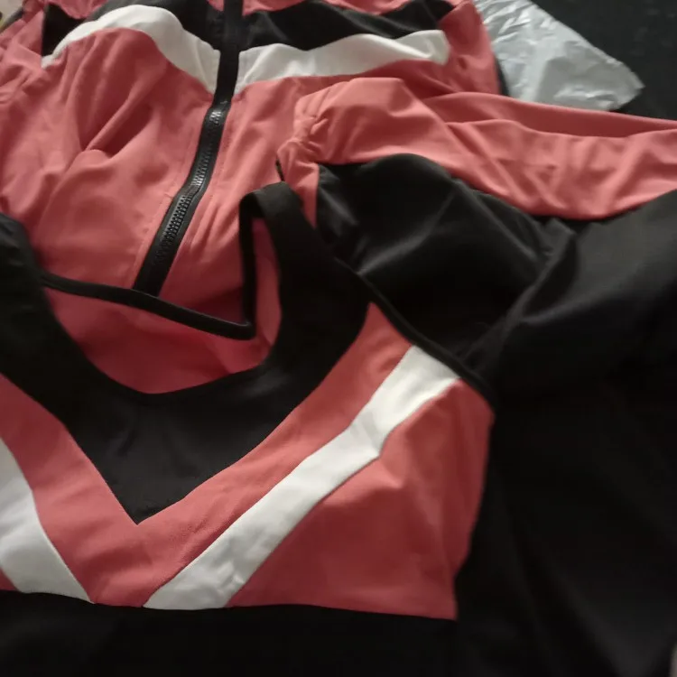 Colorblock Crop Top & High Waist Pants & Hooded Coat Set Casual Women 3 Piece Set Outfits Sleeve Style Clothing Length Collar