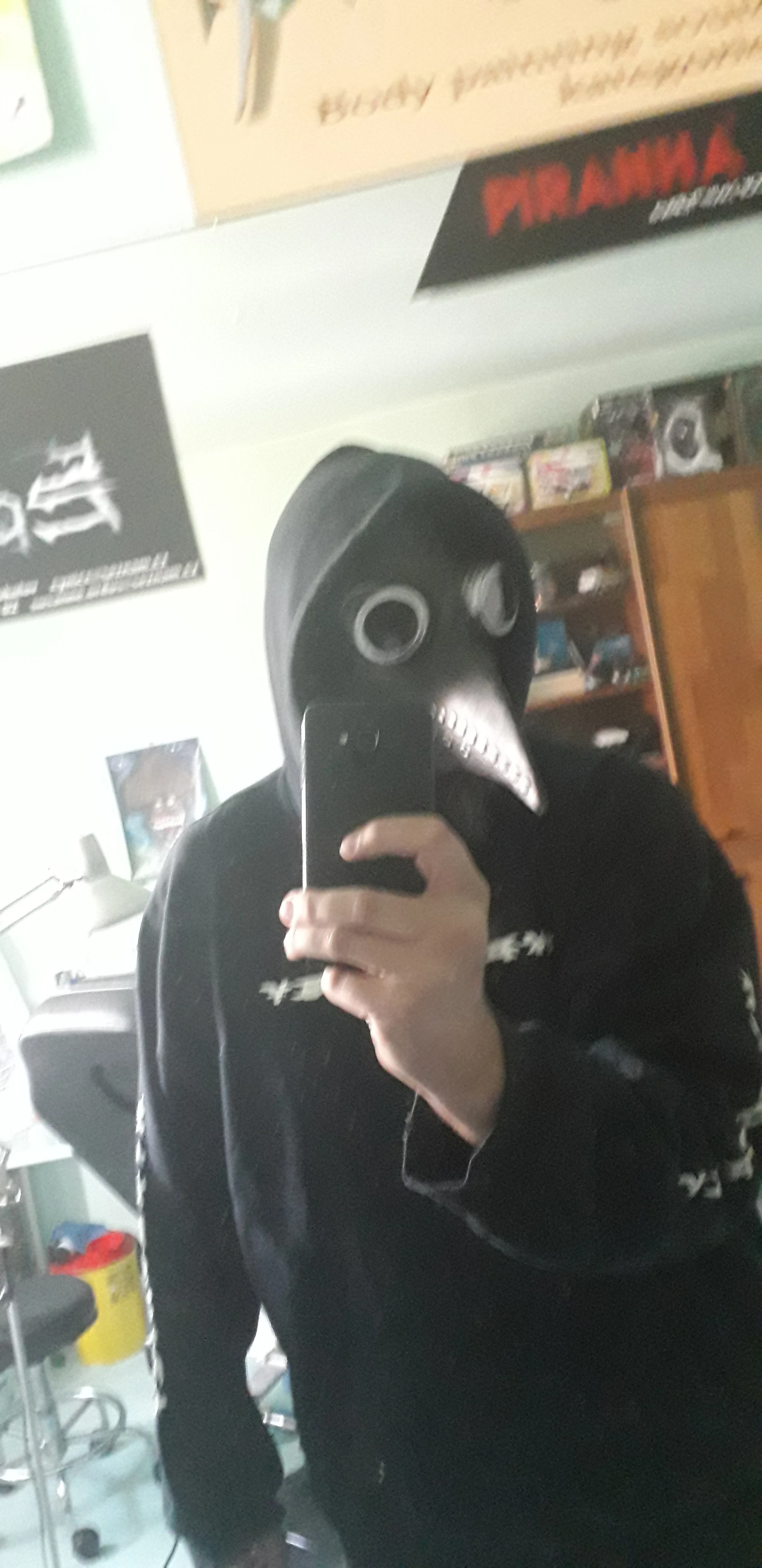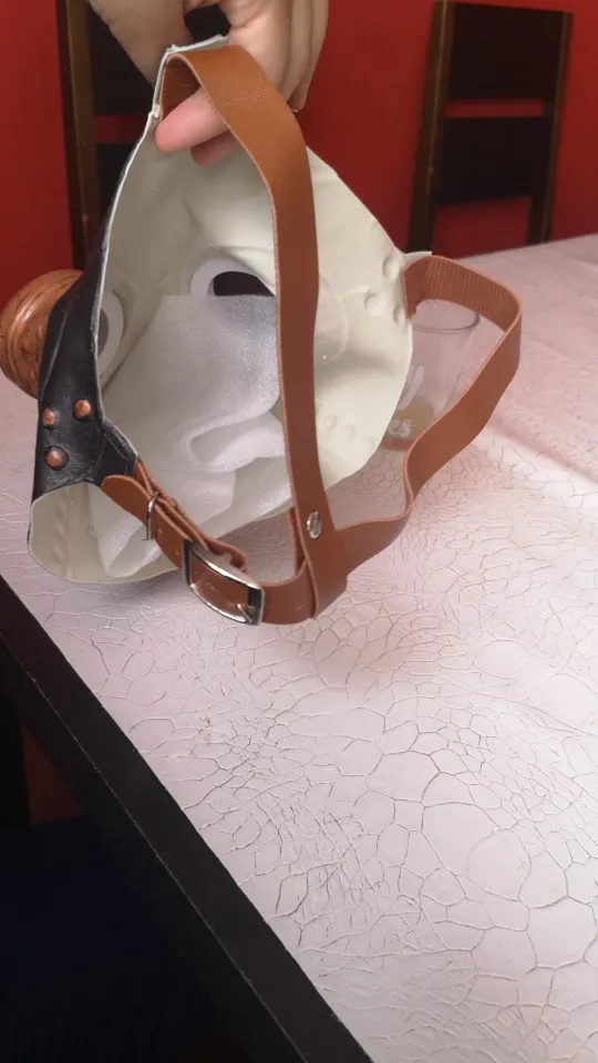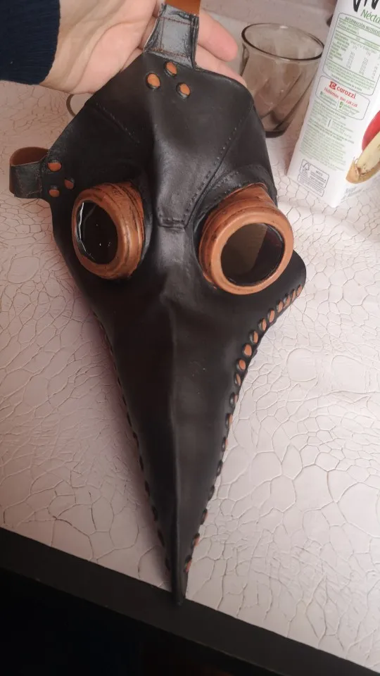Thick latex mask, with some sort of plastic for the eyes. Seems resistent. The details are painted. Can breath without problems, except for the latex smell. Overall, great product.