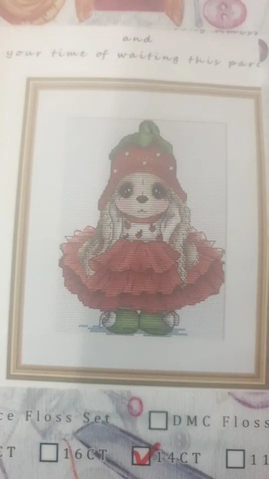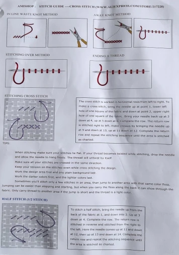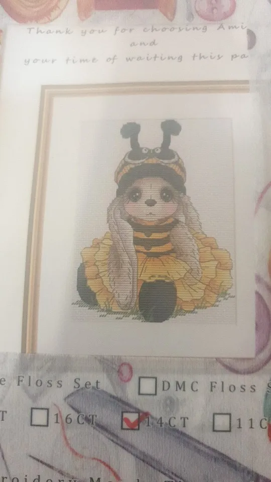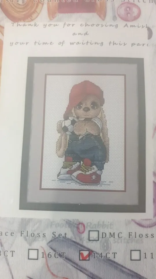 Everything in perfect condition. I'm very satisfied with the shopping. The kit is in a very practical folder. Includes two needles, a threader and a marker. I like the quality of the threads and the canvas, the edges are knitted so it won't fray. I was able to choose the color of the canvas. I have several Amishop kits on my wish list and will be shopping at this store again.