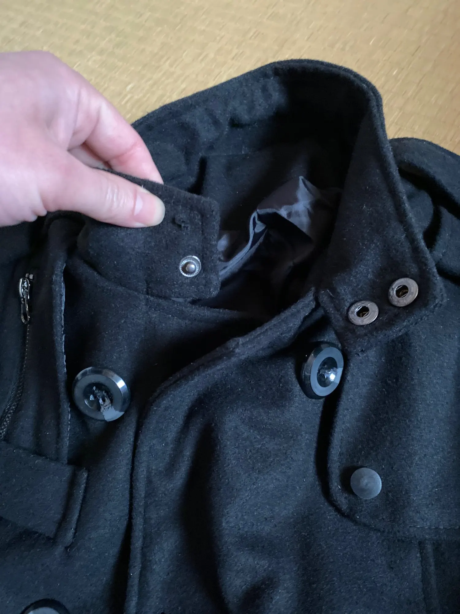 Ordered two sizes up and the coat fits perfectly. It is 10% cotton and 90% Polyester and most of the buttons and flaps are fake, but for the price the quality seems nice and it saved me a lot of money.