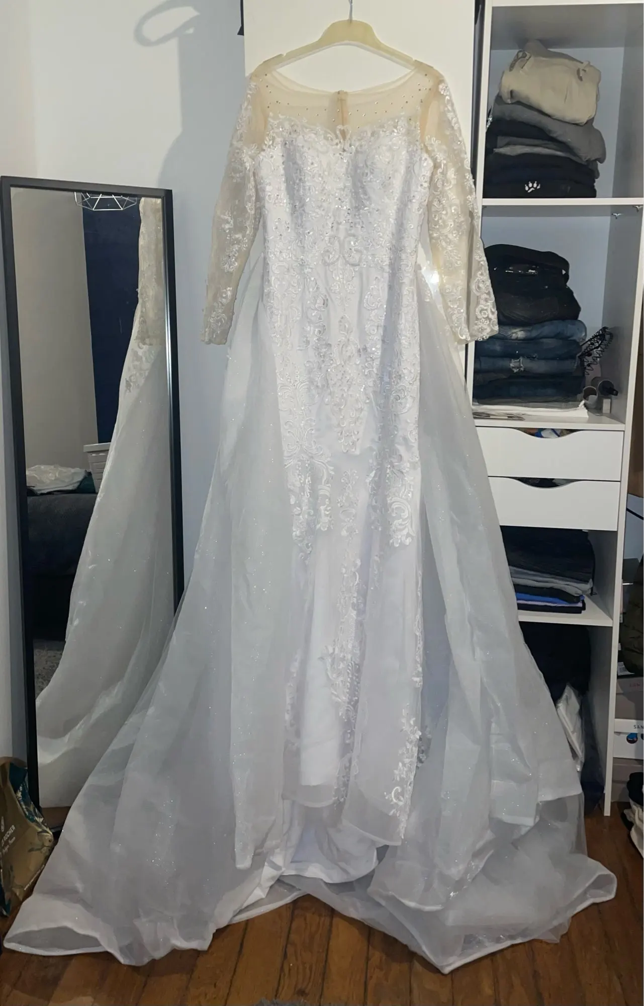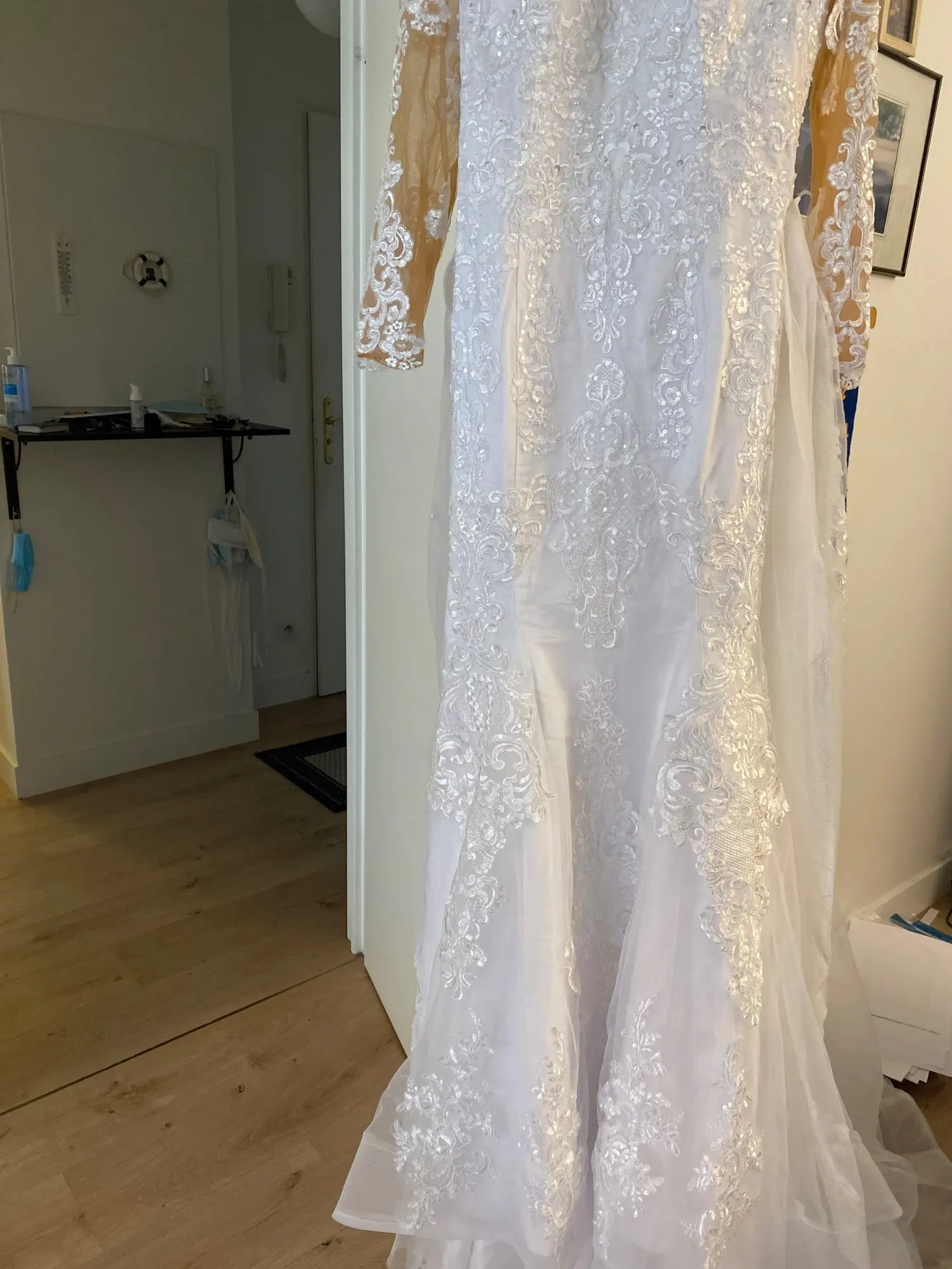 The photos of the dress is very accurate. The size correct. Beautiful dress. Im very happy with the purchase.