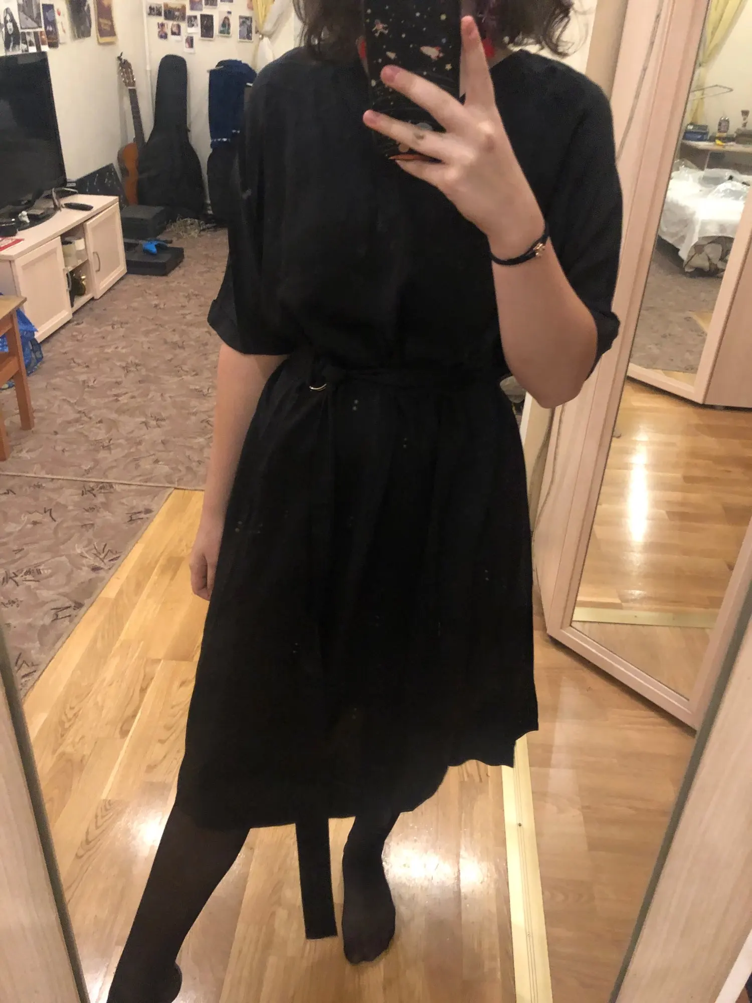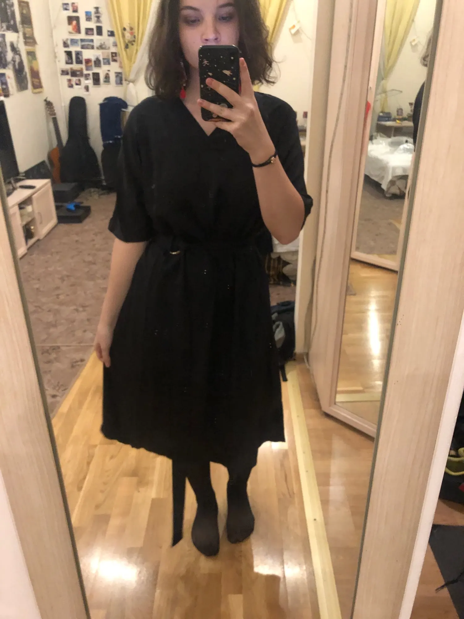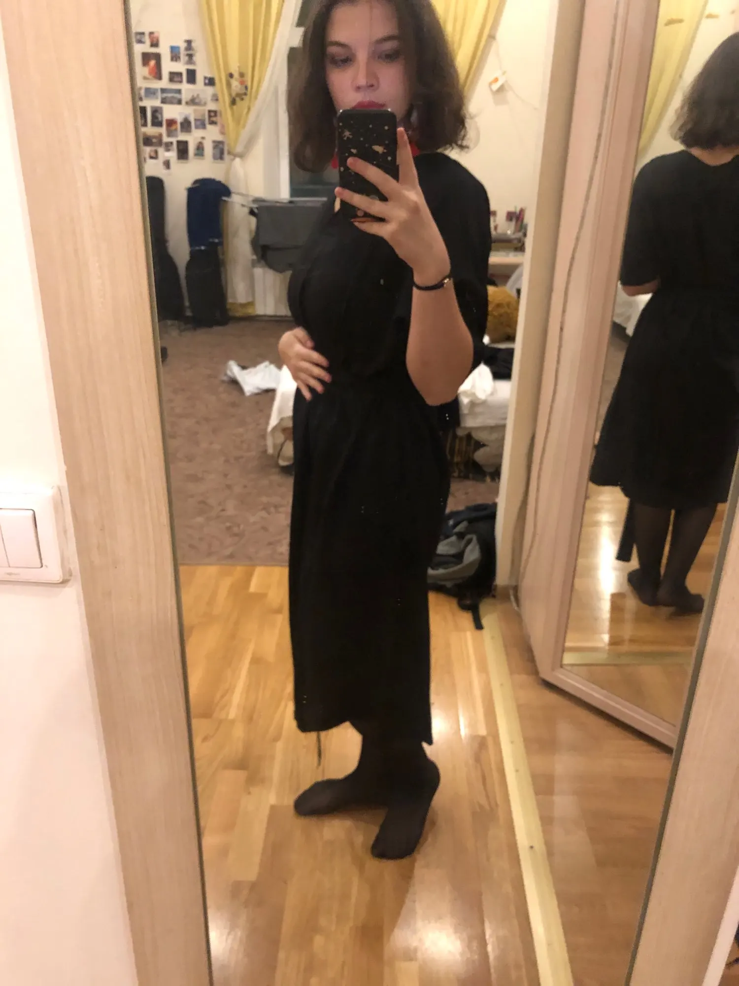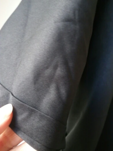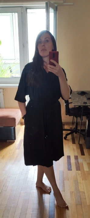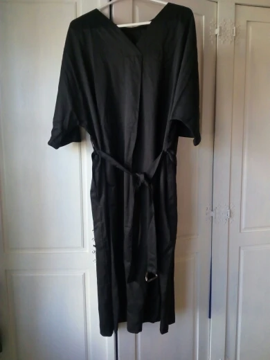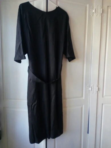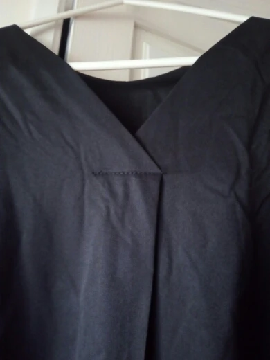 A couple of differences between the photos and the actual dress: 1) the dress fabric is somewhat shinier than what's in the photo, 2) the sleeves aren't as long, and 3) the deep-v neckline is nowhere near as low-cut. The dress itself is also really wide, and not bell-shaped as in the photo. I'm pretty disappointed in this purchase and I'm not sure I will buy anything else from this store, if their photos are always this inaccurate.