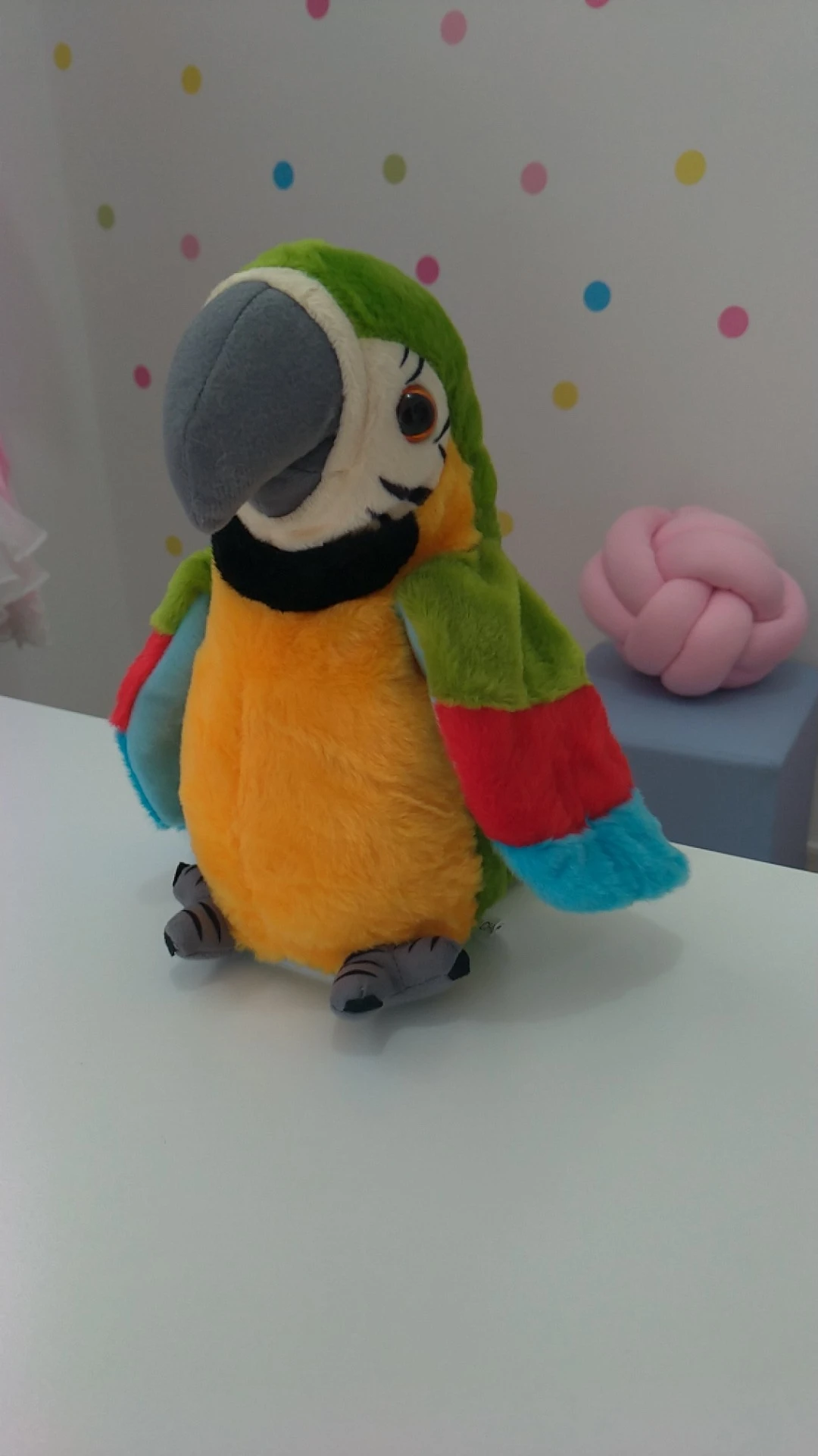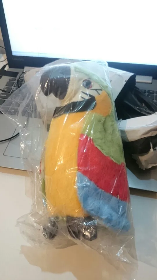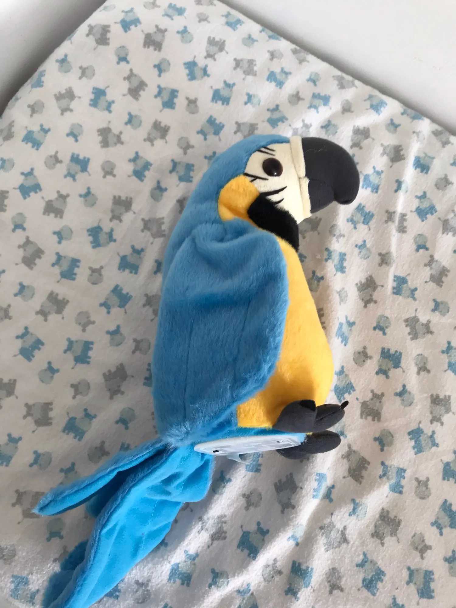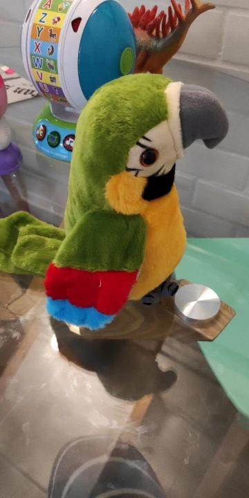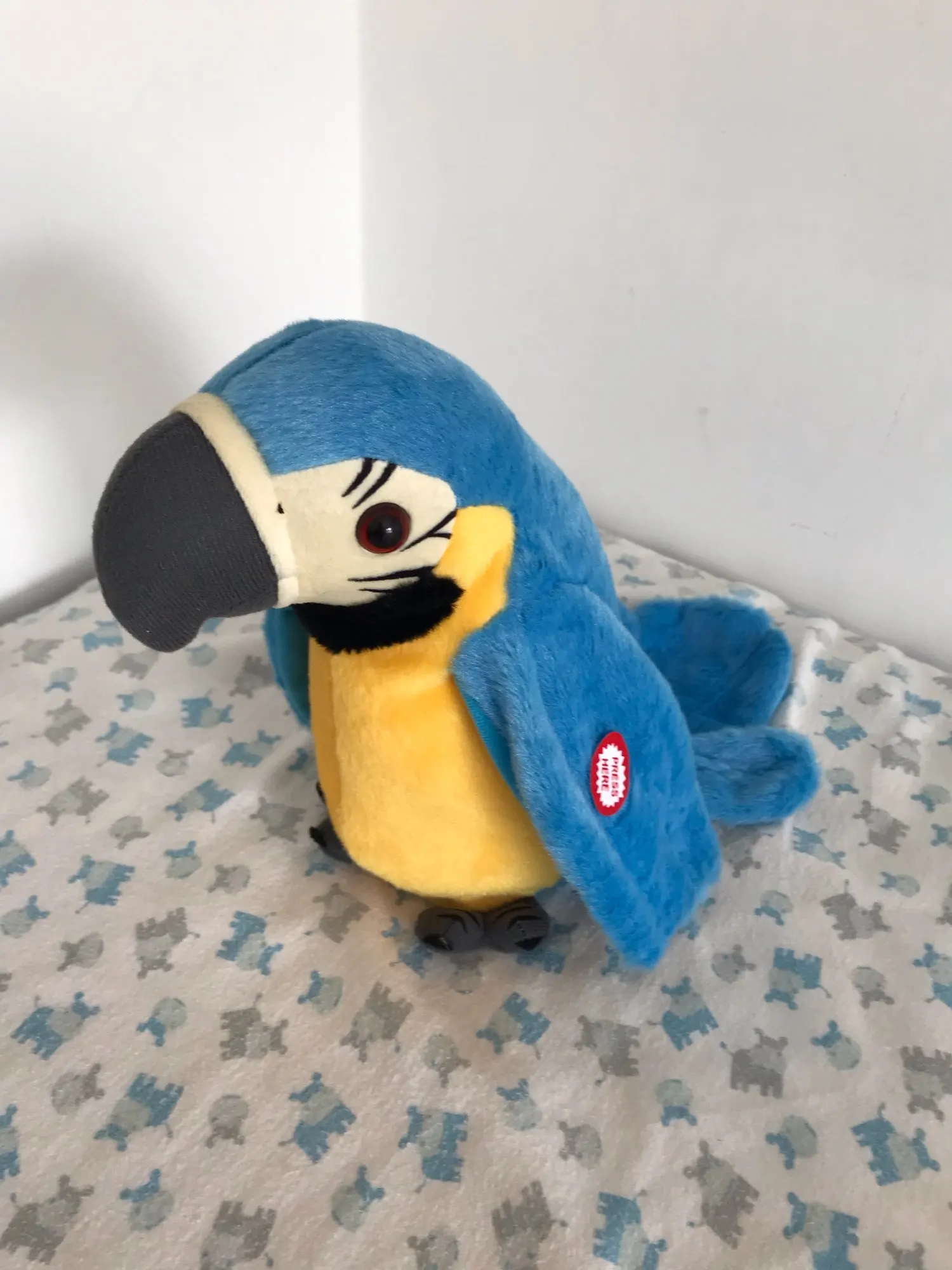 the bird doesn't just repeat what you say. plays a lot of segments of songs in English and I think Chinese. it has a switch on one wing, which starts the music. the child is delighted.
