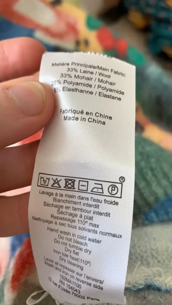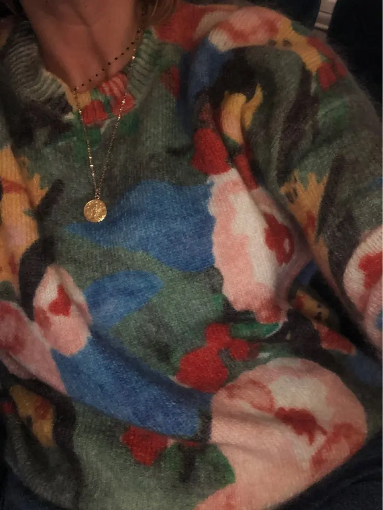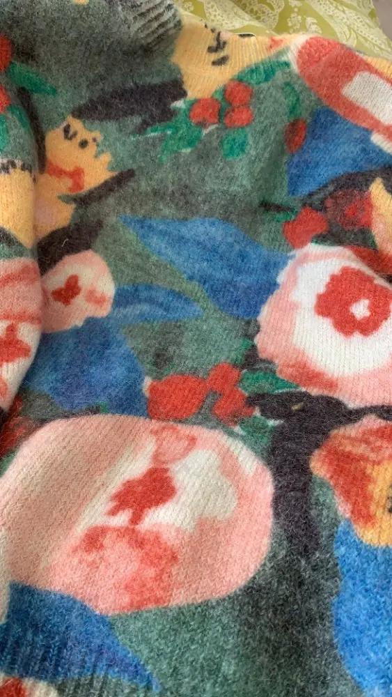 The knit is different than I expected (thicker and stretchier) but it's a good quality sweater with a beautiful print, just like the original. Unbranded.