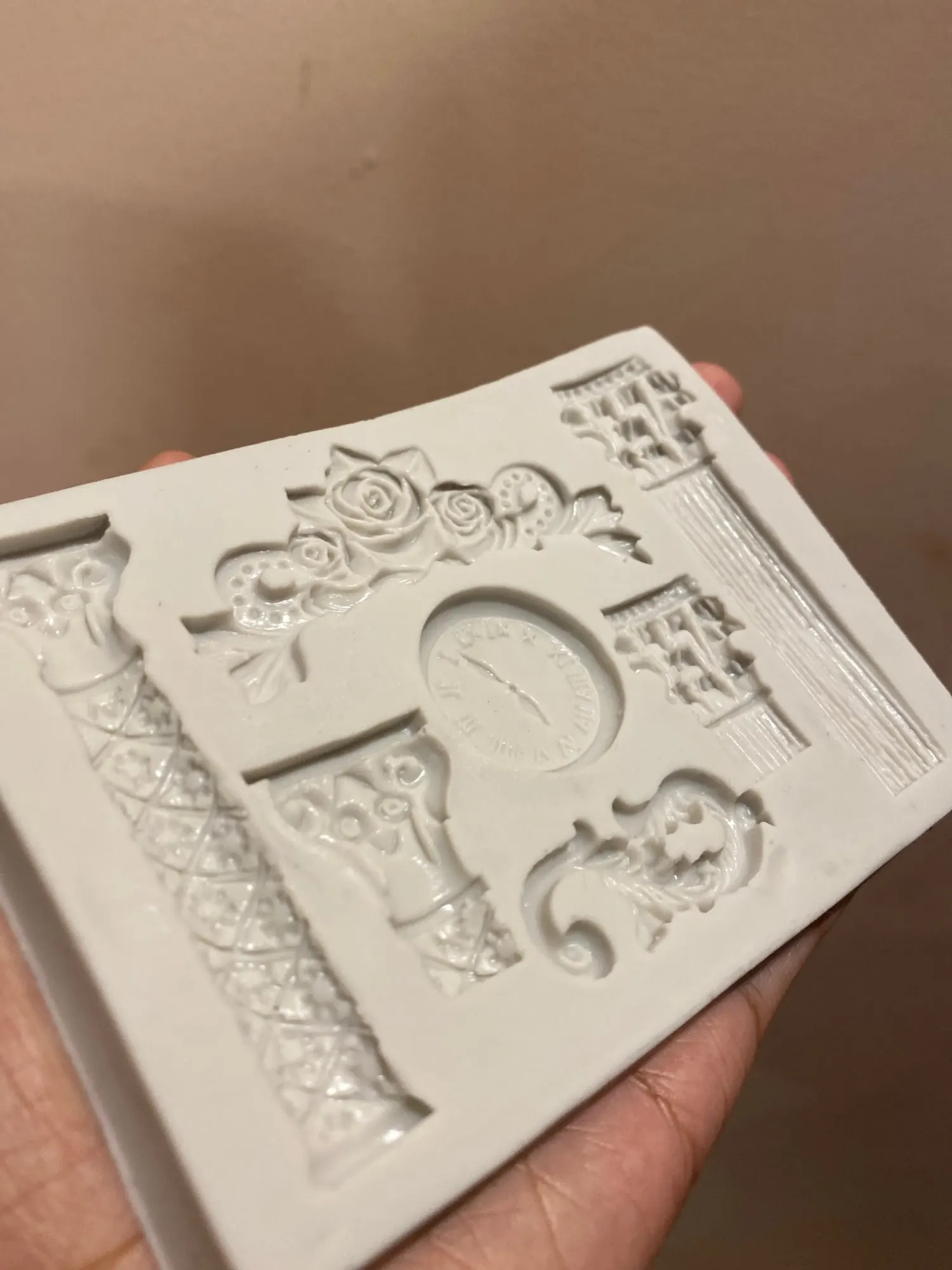 Polski Angielski Beautiful pattern. The mold is terribly curve. It is absolutely not suitable for resin castings. Everything spills out. In the rose pattern, on one side the pattern is deep and on the other side so shallow that the detail is not imprinted. I am disapointed.