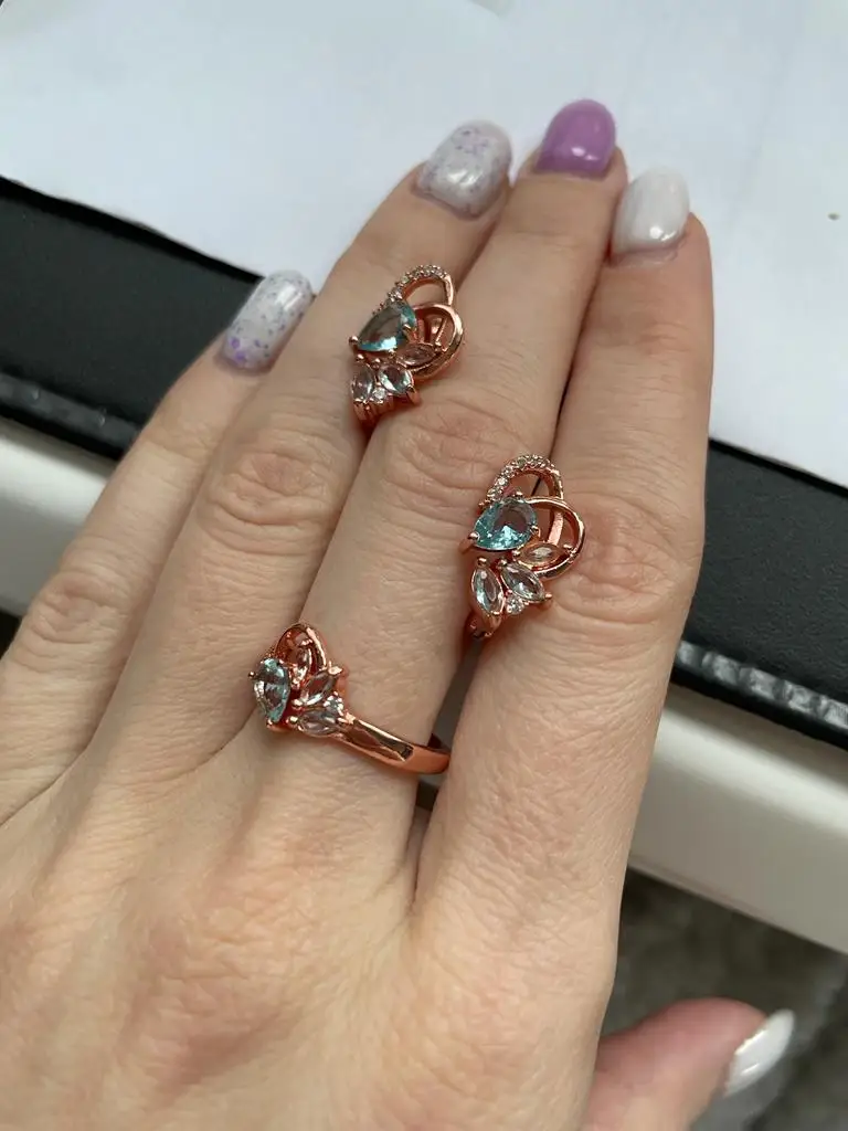 Exquisite Rose Gold Plated Bridal Jewelry Set Butterfly Shape Blue Crystal Zircon Dangle Earring Wedding Ring Engagement Jewelry